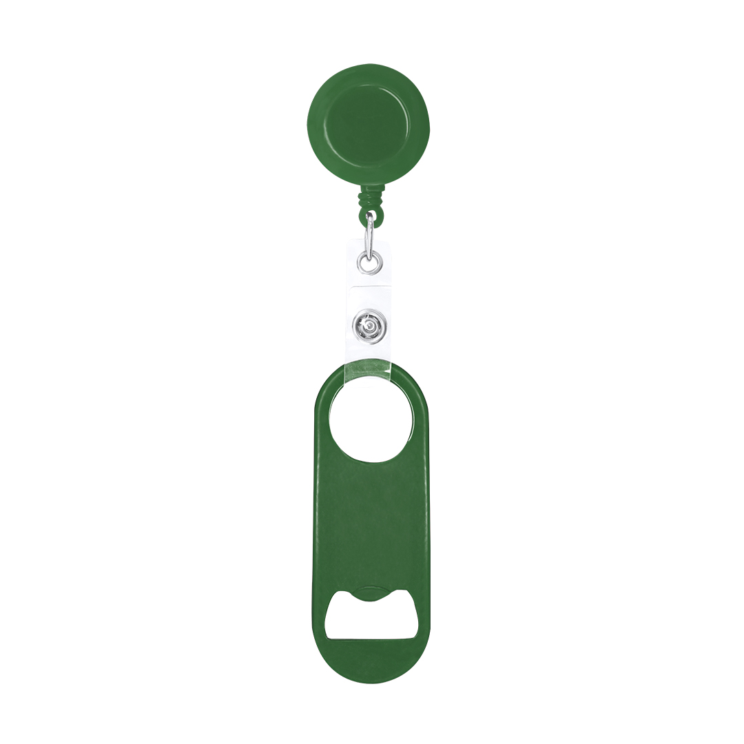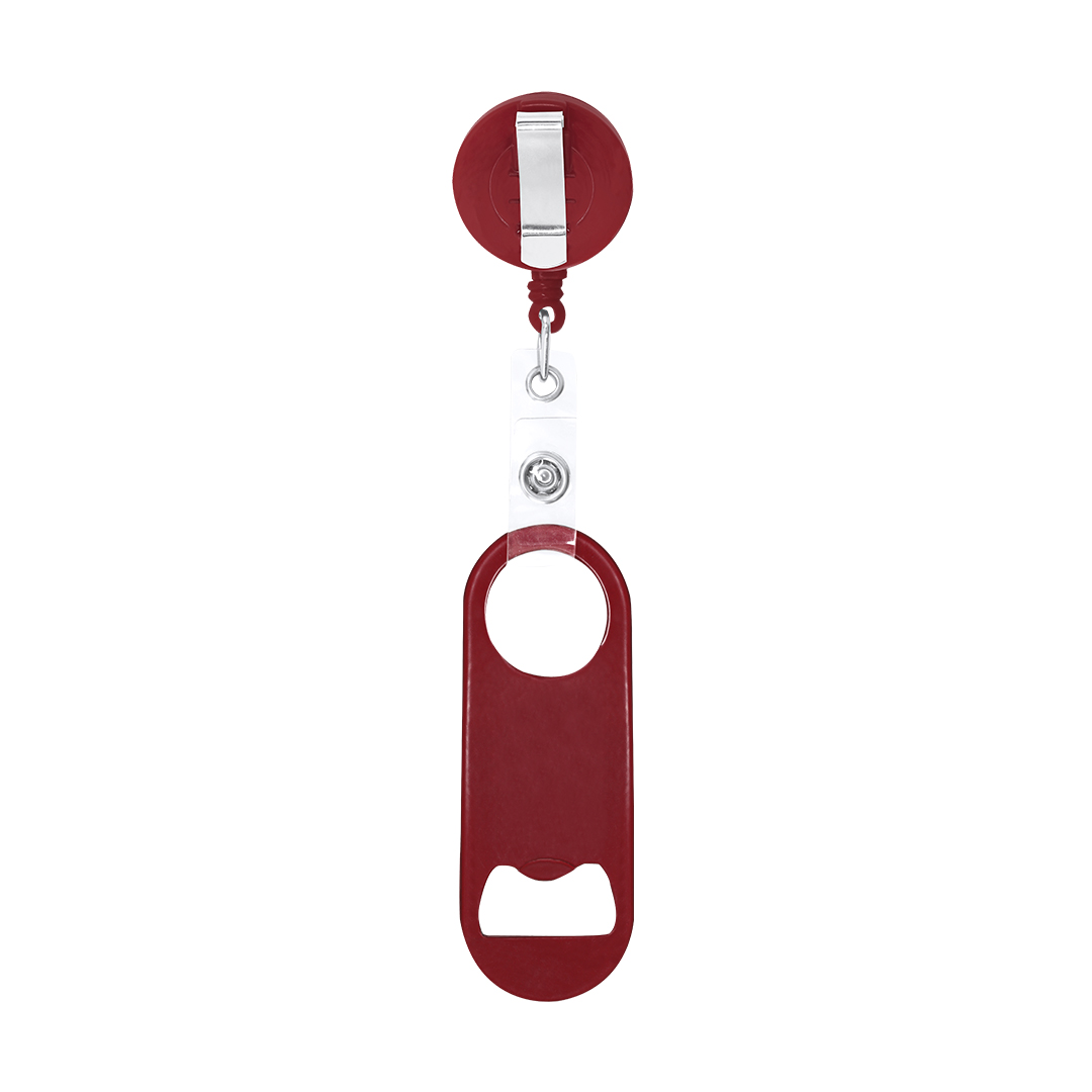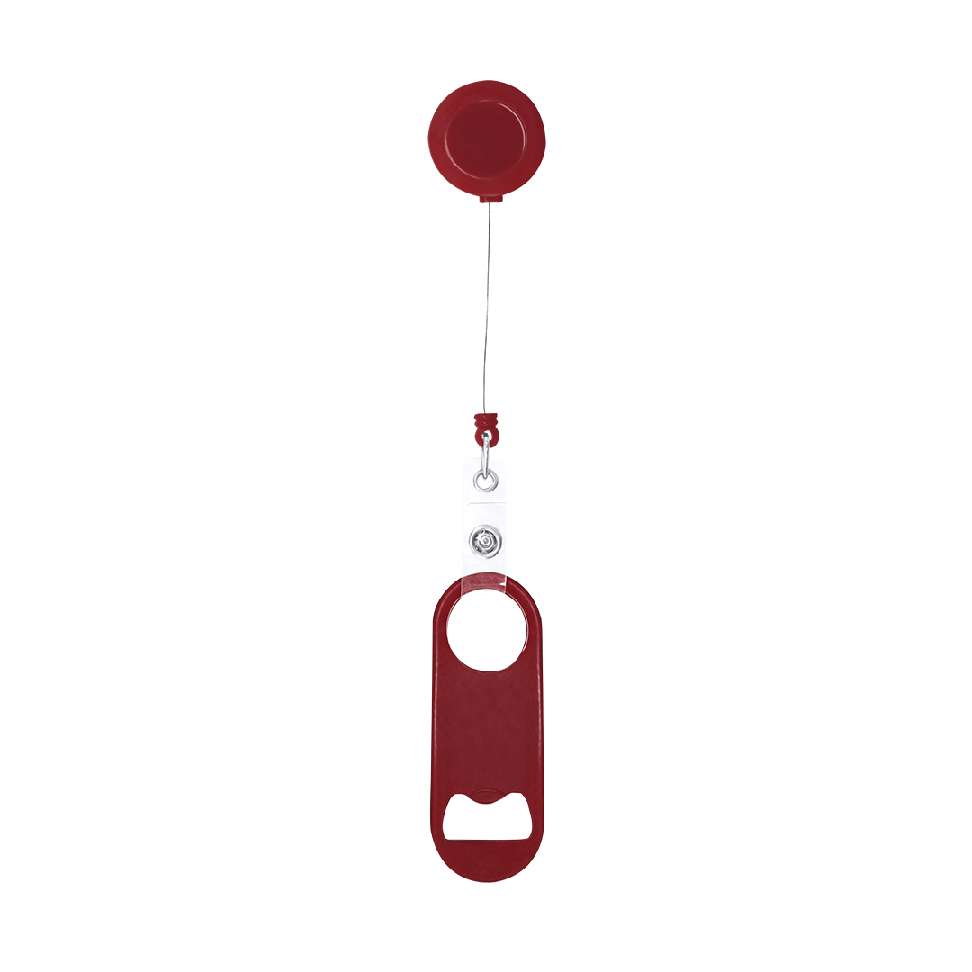 Abridor de Acero con acabado metálico brillante. Un extremo con abridor de botellas y en el extremo opuesto con orificio circular unido a través de cierre a presión a un soporte retráctil de 65 cm con clip. Práctico y funcional, permite llevarlo colgado para evitar pérdidas. Su cierre desmontable ofrece la opción de usar únicamente el abridor o de engancharlo por separado a un lanyard. Soporte Extensible Acero al Carbono/ ABS