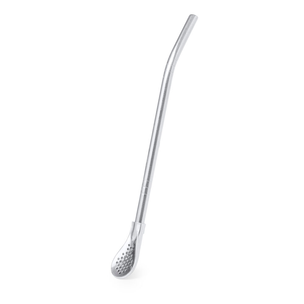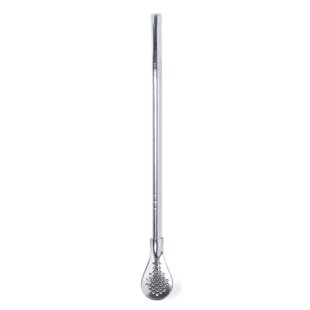 Práctico agitador con pajita en acero inox. Con diseño elegante y funcional, este accesorio es esencial para bebidas frías o calientes. Pajita integrada que permite absorber con facilidad y en el extremo inferior una práctica cucharilla con filtro. Presentado en una bolsa individual. Acero Inox