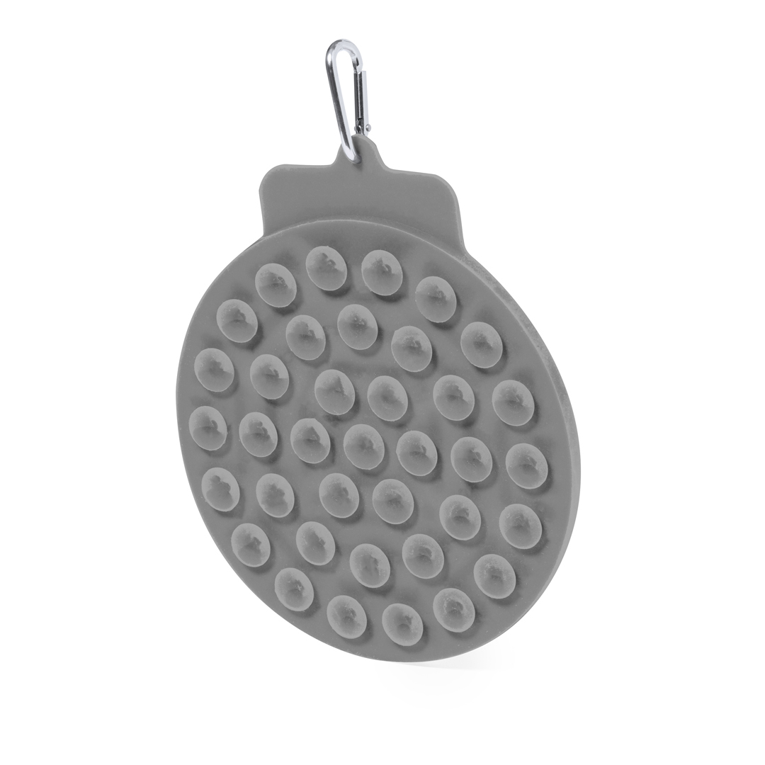 Almohadilla de mascotas para lamer fabricada en suave silicona. Con potentes ventosas para fijarla en superficies planas y que las mascotas puedan lamer su rugosa superficie. Mosquetón de transporte incorporado de fácil enganche. Presentado en una bolsa individual reciclada. Silicona
