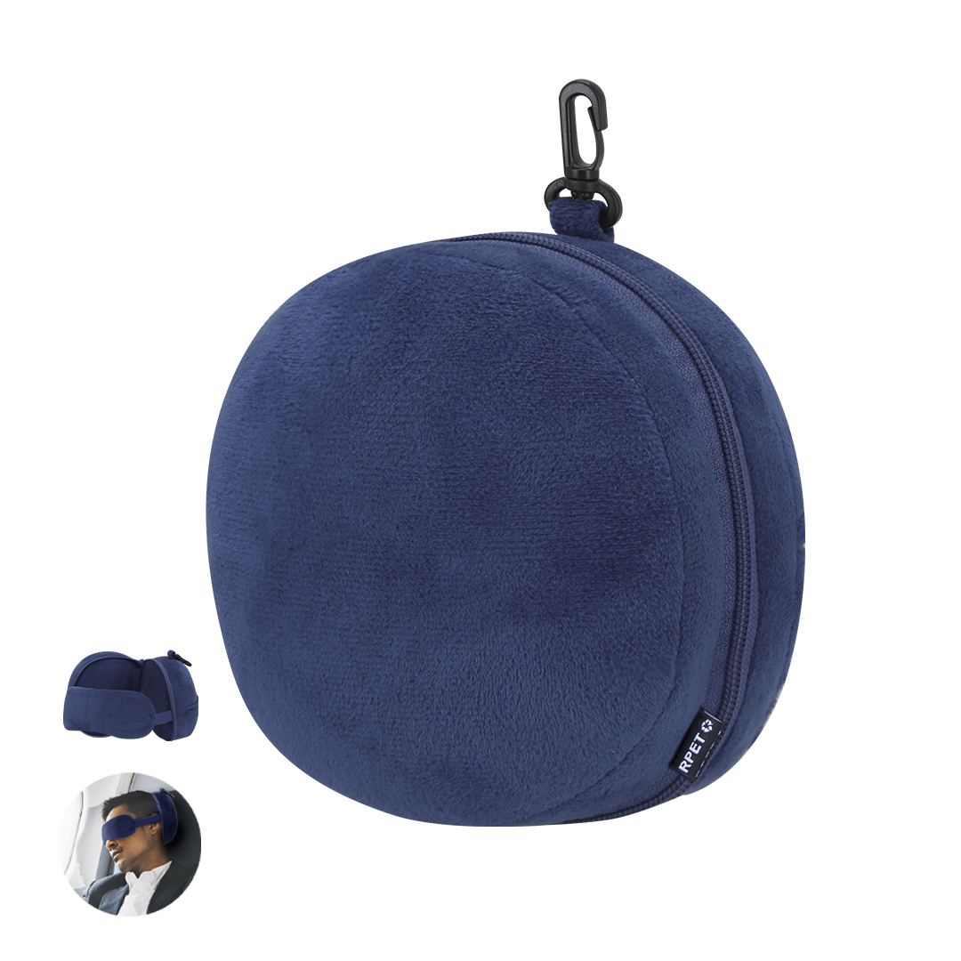 Almohadilla con Antifaz ideal para viajes fabricada en suave material RPET.Incluye antifaz interior adaptable mediante dos gomas elásticas a juego para mayor comodidad y descanso durante el viaje. Cuenta con un esponjoso reposacabezas plegable con cierre de cremallera, lo que facilita su almacenamiento. Además, dispone de práctico bolsillo exterior y mosquetón de plástico en color negro, que permite transportarlo de cómoda.Este accesorio combina funcionalidad, diseño compacto y siendo perfecto sus viajes.El material RPET se elabora a partir de plástico reciclado, para así fomentar la reutilización de residuos plásticos y ayudar a la sostenibilidad del planeta. Poliéster RPET