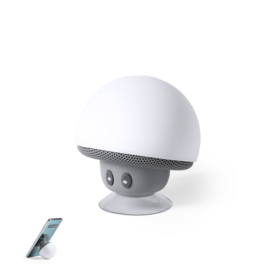 Altavoz de original diseño seta con función soporte para móvil. Conectividad Bluetooth 5.0, con 3W de potencia y función manos libres. Cuerpo con suave acabado de tacto goma y ventosa de fijación para función soporte. Cable micro USB incluido y presentado en atractiva caja de diseño. Conexión Bluetooth. Potencia Sonido 3W. Batería 200 mAh