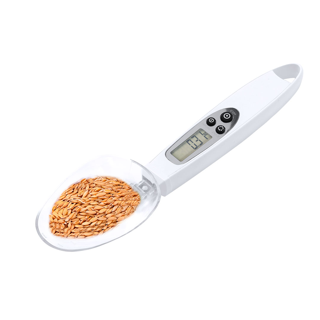 Práctica báscula digital con cuchara, válida para líquidos y sólidos. Incluye 2 cucharas intercambiables y pantalla digital LCD situada en el mango, mostrando el pesaje con una precisión de 0,1g. Botón para mostrar el peso en gramos (g), onzas (oz), o mililitros ( ml), con función de memoria y posibilidad de pesar dos ingredientes. Ambas cucharas llevan grabada una escala de medición adicional para líquidos: la cuchara pequeña desde 5 ml hasta 25 ml; y la cuchara grande desde 10 ml hasta 50 ml. Con manual de instrucciones en español e inglés. Alimentada por pila de botón (incluida) y presentada individualmente en caja de diseño kraft. 2 Accessorios 50 ml y 25 ml. Max 300 g. Pila Botón Incluida