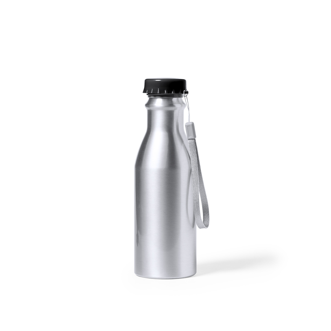 Bidón de 500 ml de capacidad, fabricado en aluminio de acabado brillo. Con original tapón chapineta en negro, a rosca y con cinta de transporte. Libre de BPA y presentado en caja individual de diseño kraft. 500 ml Aluminio