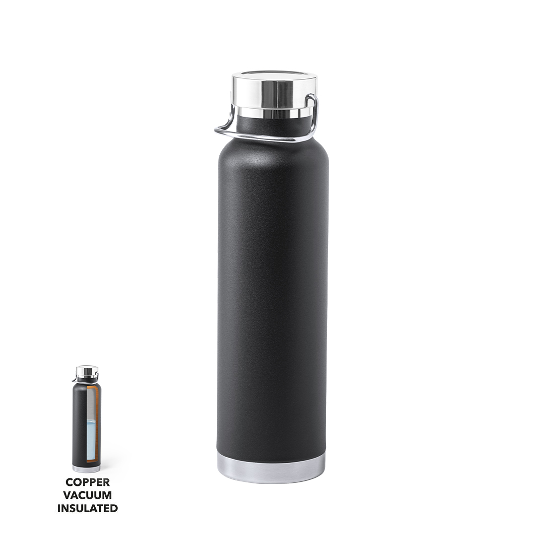 Bidón térmico de acero inox, con doble capa y aislamiento de cobre al vacío. El mismo le permite mantener el calor y el frio durante un tiempo más prolongado, llegando a las 12 y 48 horas respectivamente. De 650ml de capacidad, y disponible en variada gama de colores metalizados. Presentado en atractiva caja de diseño. 650 ml. Aislamiento de Cobre al Vacío Acero Inox