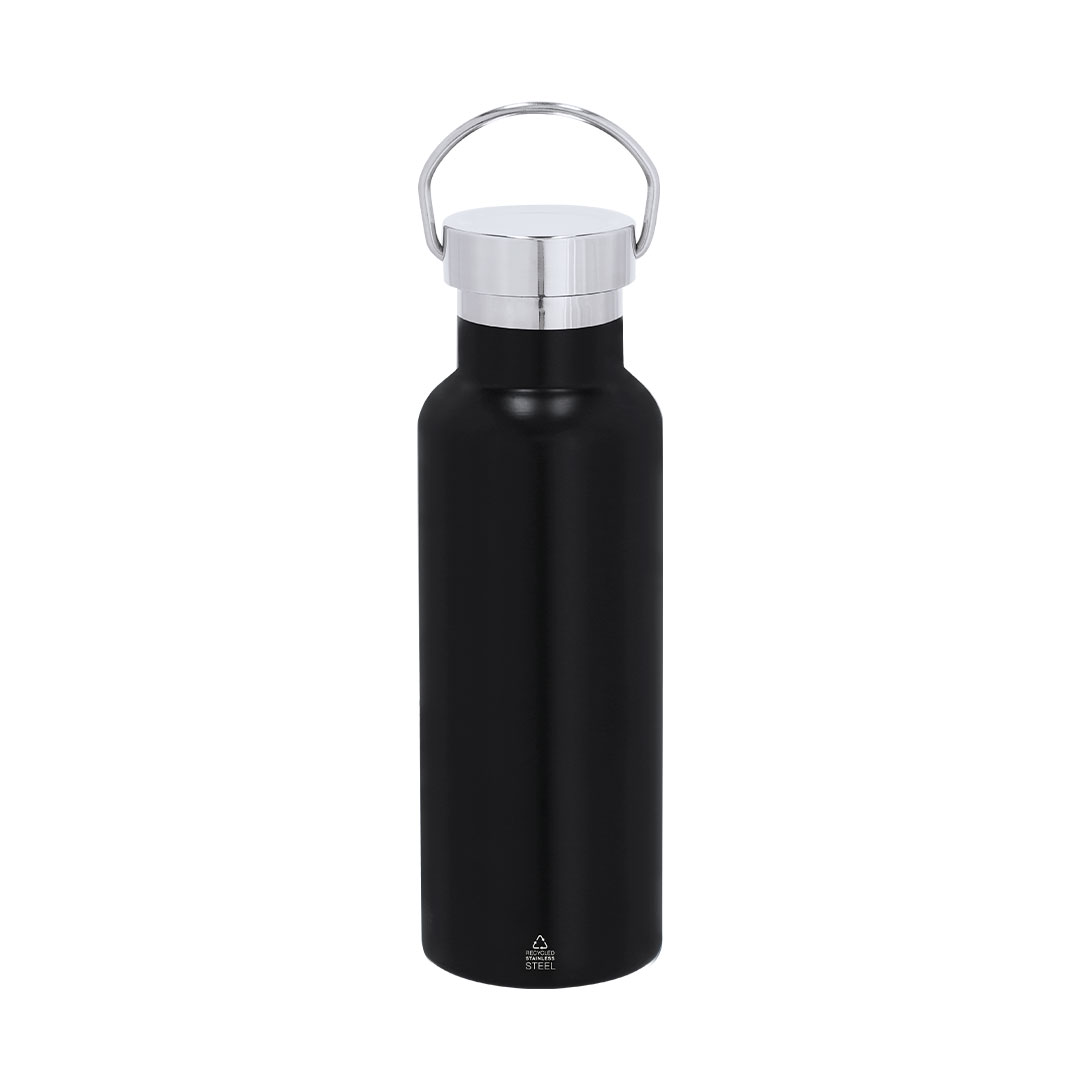 Bidón termo en Acero Inox Reciclado de 500 ml de capacidad. Con doble pared para mejor y más duradera conservación de la temperatura e interior con recubrimiento de cerámica, apto para bebidas carbonatadas. Tapón a rosca con sólida asa de trasporte en acero pulido. Con distintivo de Acero Inox Reciclado.El acero es uno de los materiales más demandados y que puede encontrarse casi en todas partes, desde productos de uso diario a grandes construcciones. Con innumerables propiedades, entre las que cabe destacar la durabilidad y su alto grado de reutilización, convirtiéndolo en una alternativa muy valorada en soluciones de sostenibilidad. Debidamente tratado, permite obtener nuevos recursos de infinita utilización. 500 ml Acero Inox Reciclado/ Interior cerámico