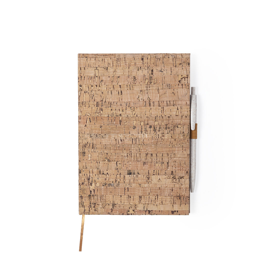 Bloc de notas de línea nature con tapas duras en corcho natural, de sobrio diseño. Incluye 100 hojas blancas lisas, con marcapáginas y soporte para bolígrafo a juego. Portada Rígida. 100 Hojas Corcho