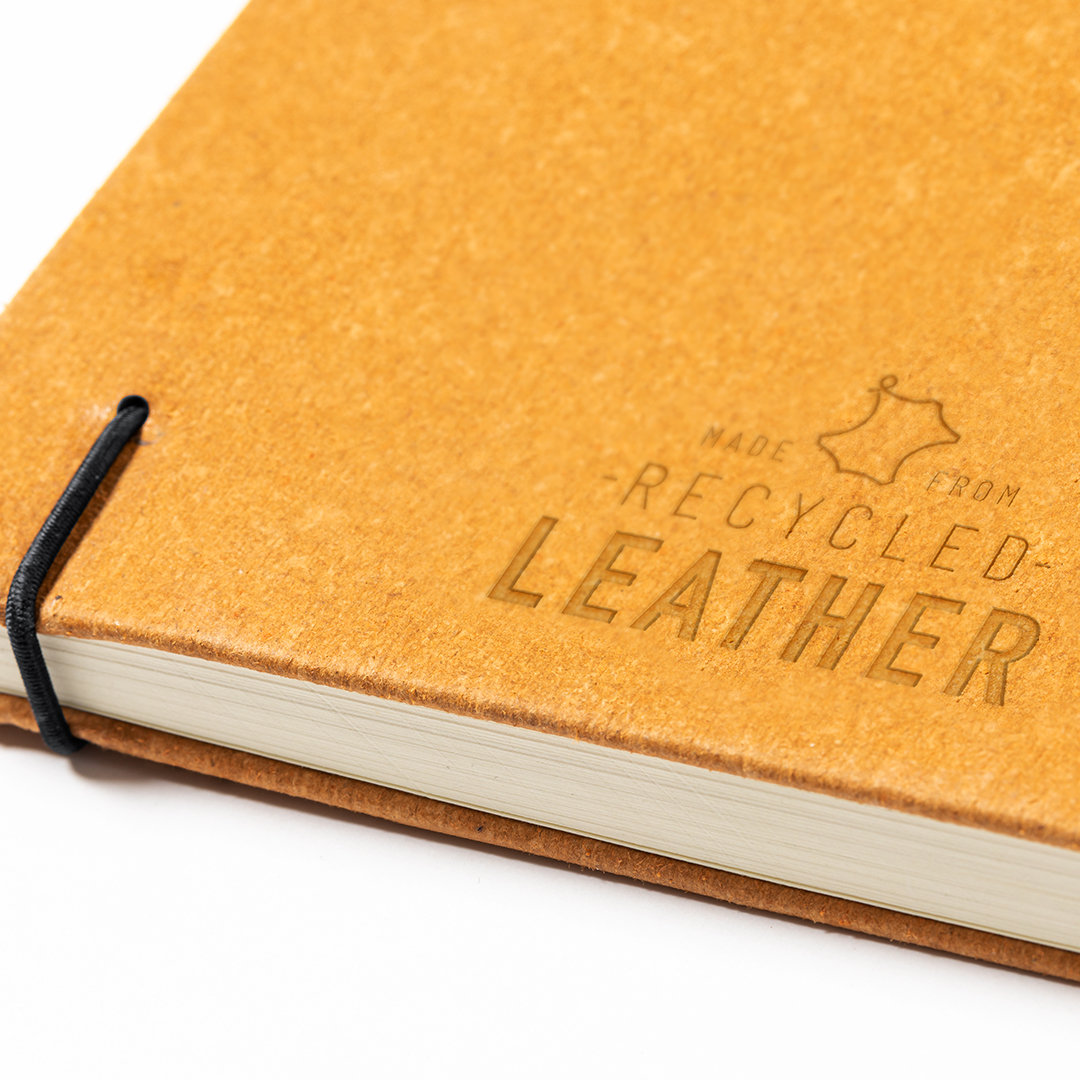 Bloc de notas de línea nature. Con tapas rígidas fabricadas en cuero reciclado, que rescata las fibras desechadas en los procesos de fabricación, minimizando el desperdicio de material, contribuyendo a reducir el impacto ambiental y manteniendo a la vez sus propiedades originales. Interior con 100 hojas de disposición a una raya. Incluye marcapáginas, elástico de cierre y soporte para bolígrafo a juego. Incluye distintivo cuero reciclado. Portada Rígida. 100 Hojas Cuero Reciclado