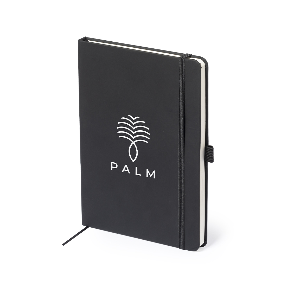 Bloc de notas fabricado en polipiel de elegante acabado en negro. Con tapas duras, marcapáginas y elástico de sujeción a juego. Interior con 100 hojas de disposición a 1 raya y soporte para bolígrafo (bolígrafo no incluido).   Portada Rígida. 100 Hojas   Polipiel