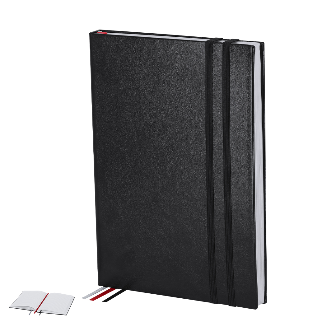 Bloc de notas en tamaño A5 con cubiertas rígidas y suaves, elaborado en PU reciclada y RPET. Marcapáginas en cinta en tres colores diferentes (negro, rojo y gris) para fácil planificación del día a día y doble cinta elástica de cierre a juego. Incluye 128 hojas color blanco con disposición a rayas y un práctico bolsillo de papel para notas sueltas. Ideal para llevar un diario y mantener la planificación durante todo el año. Con distintivo de PU Reciclado.La PU Reciclado destaca por su resistencia y elasticidad. Este material reciclado y reciclable es una opción sostenible que rescata las fibras desechadas en los procesos de fabricación, minimizando así el desperdicio de material y contribuyendo a su vez a reducir el impacto ambiental, manteniendo a la vez sus propiedades originales.   Portada Rígida. 128 Hojas   PU Reciclada/ Poliéster RPET