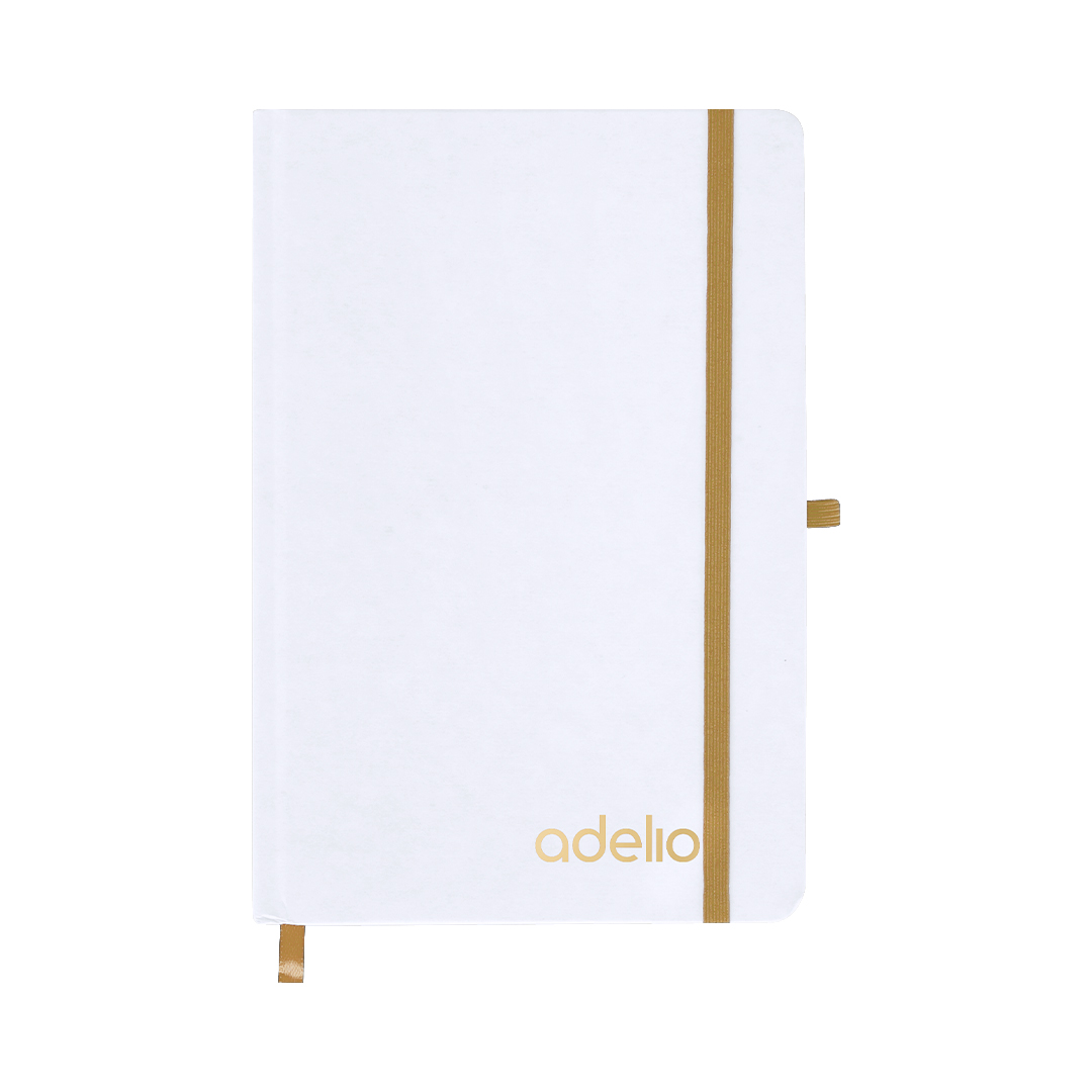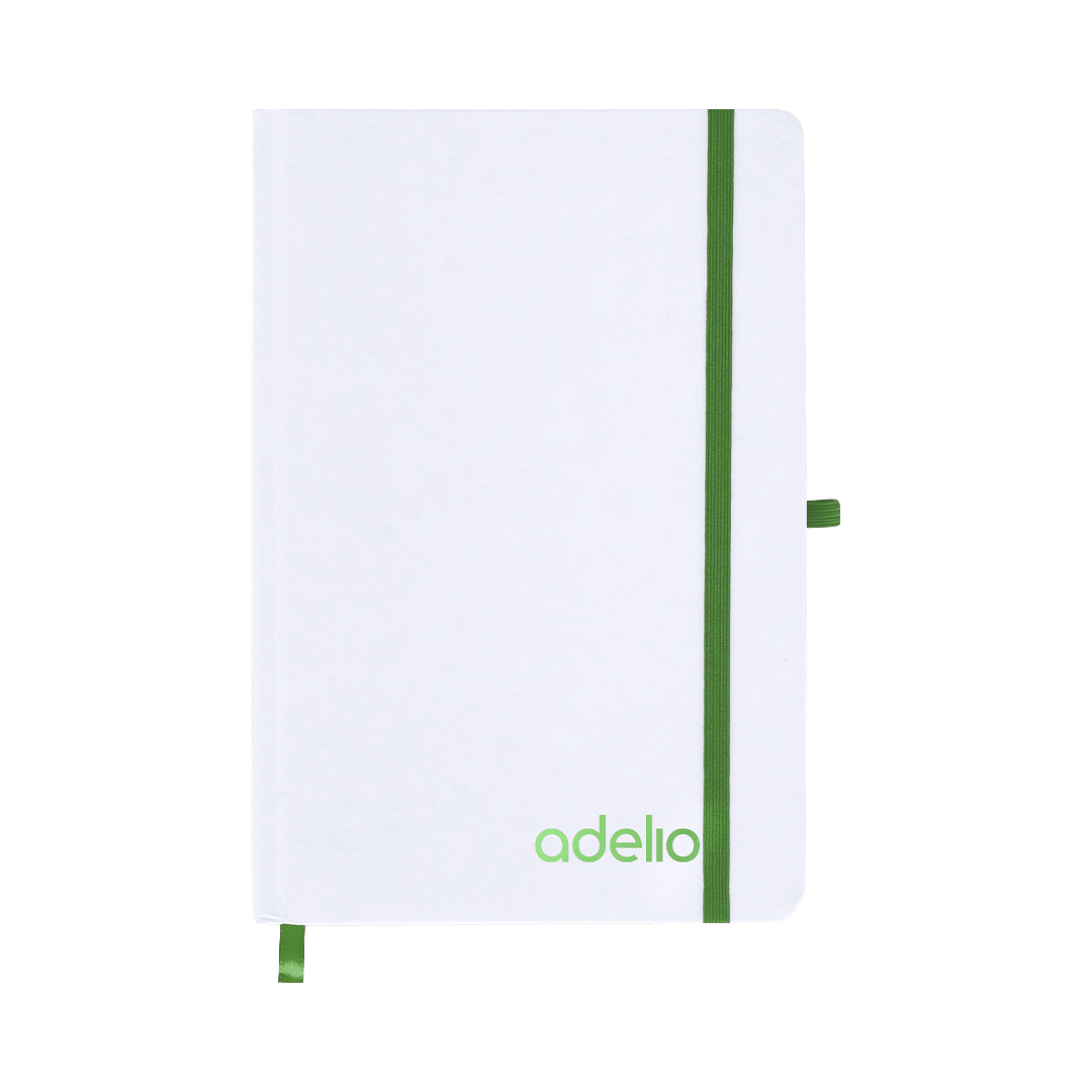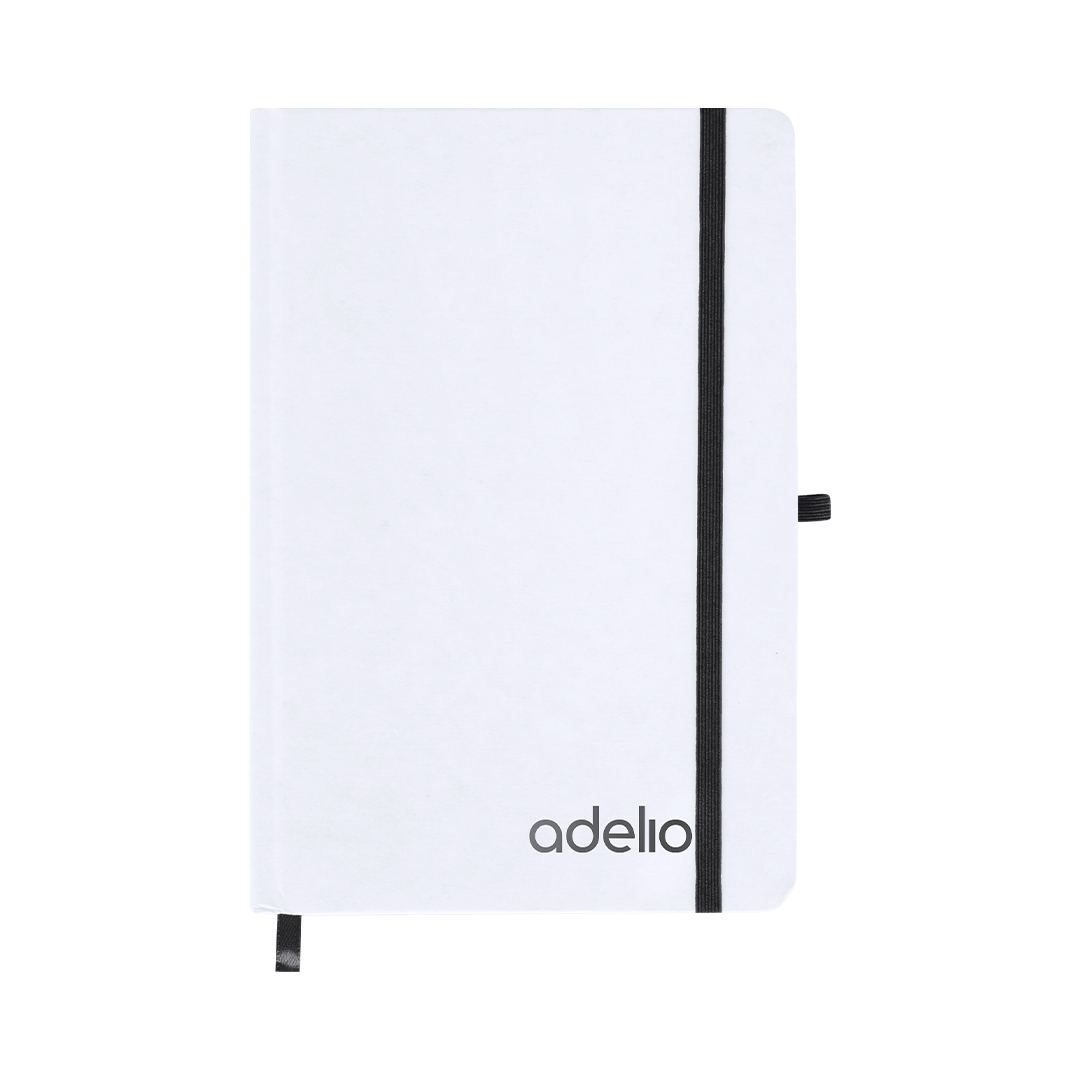 Bloc de notas con tapas rígidas blancas fabricadas en Cartón Reciclado. Interior con 80 hojas a disposición de una raya. Incluye marcapáginas, en mismo color que cinta elástica de cierre y portabolígrafos. Especial para grabado láser mostrando el color seleccionado. Portada Rígida. 80 Hojas Cartón Reciclado