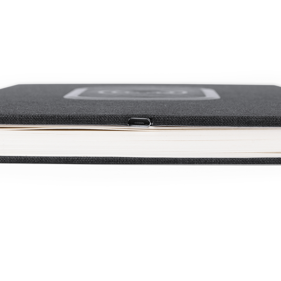 Bloc de notas cargador en resistente poliéster 300D con cargador inalámbrico integrado. De sobrio diseño y original estación de carga en la portada. Incluye 80 hojas con disposición a una raya. Inalámbrico 5W. Portada Rígida. 80 Hojas Poliéster 300D