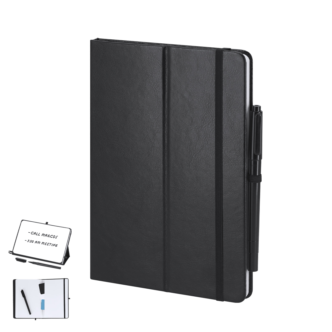 Bloc de notas pizarra en PU reciclado. Con pizarra en primera página, incluye bolígrafo rotulador y borrador en tinta negra. Con 80 hojas a disposición de una raya. Portada plegable con función soporte, y cinta elástica para cierre seguro.Ideal para tomar notas rápidas, apuntes, crear diseños en tu jornada laboral o en casa.Incluye distintitov logo PU Reciclado. 80 Hojas. Bolígrafo Rotulador Tinta Negra y Paño Limpiador Incluido PU Reciclada