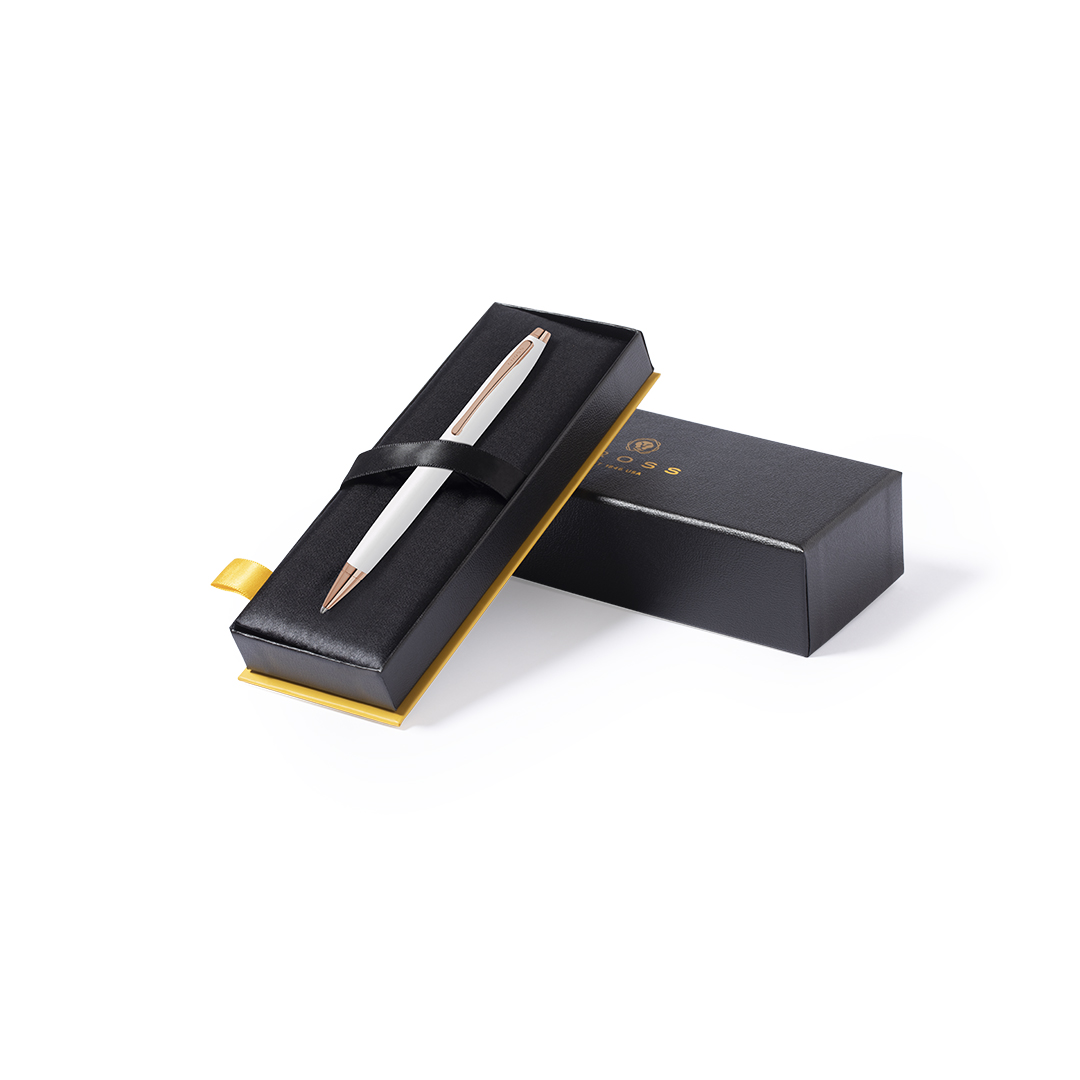 Bolígrafo Cross con mecanismo retráctil, de distinguido diseño bicolor blanco con elegantes toques de oro rosa. Cuerpo metálico en suave acabado y original clip con logotipo. Presentado en elegante estuche individual en color negro, con logotipo de la marca e interior en suave antelina a juego. En tinta negra. Tinta Negra Metal