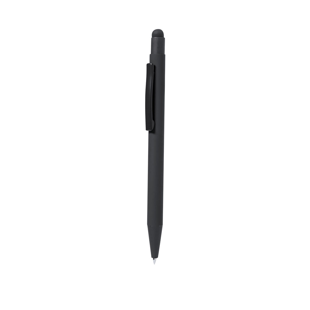 Bolígrafo puntero fabricado en aluminio. De mecanismo pulsador con puntero y clip metálico a juego con el cuerpo. Cuerpo terminación en goma, especialmente diseñado para marcaje en láser. De cartucho jumbo y en tinta azul. Carga Jumbo Aluminio. Acabado Caucho
