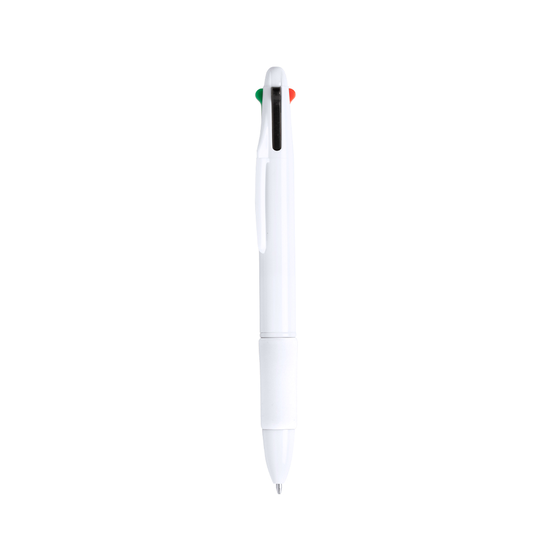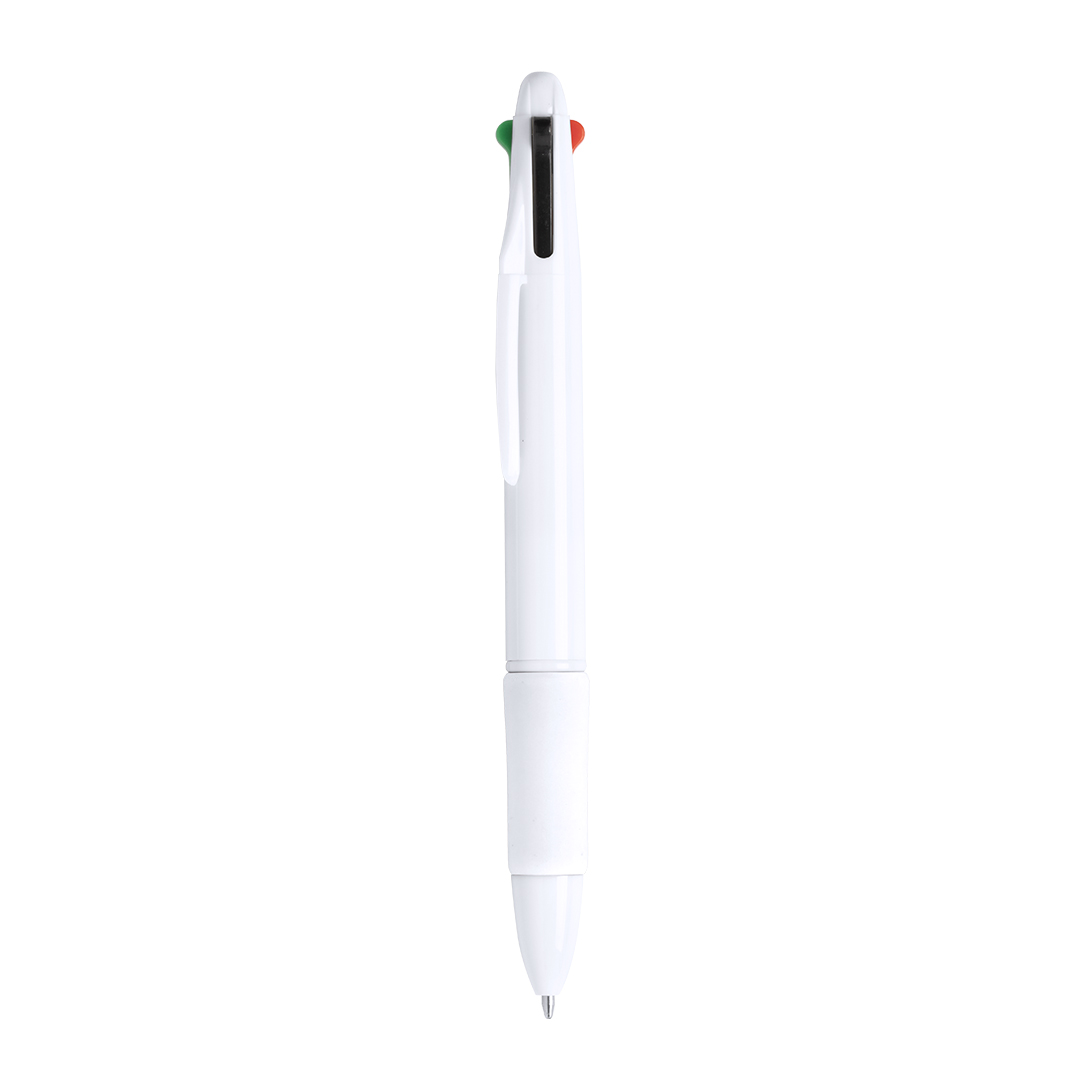 Bolígrafo 4 en 1 de mecanismo pulsador retráctil, de clásico diseño y cuerpo de suave acabado sólido en color blanco. Suave empuñadura a juego en vivos colores. De 4 cartuchos, en tintas azul, negra, roja y verde. Escritura 4 Colores