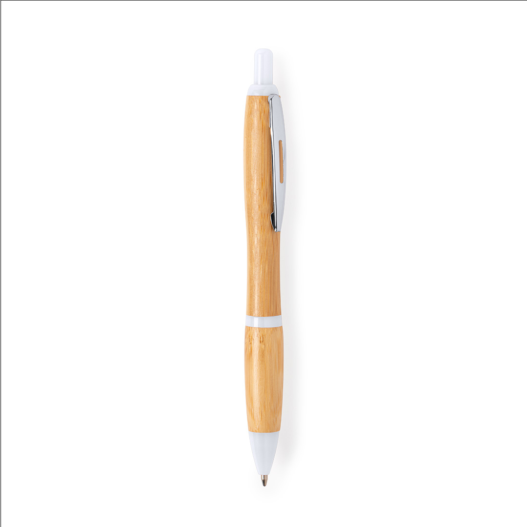 Bolígrafo con mecanismo pulsador de línea nature, con cuerpo en bambú y detalles en variada gama de colores. Con original clip metálico troquelado y cómoda empuñadura de bambú. Tinta azul. Bambú