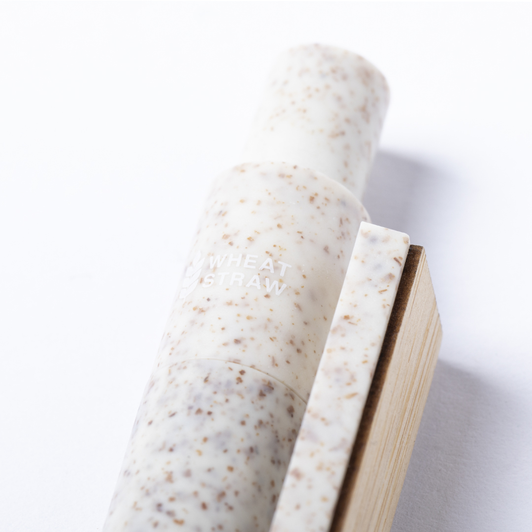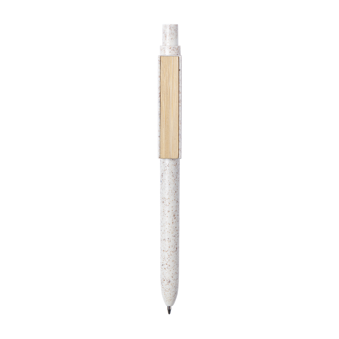 Bolígrafo de línea nature y mecanismo pulsador. Cuerpo fabricado en combinación de caña de trigo y clip en bambú, para así fomentar la utilización de materias primas naturales y reducir las emisiones contaminantes. Clip con amplia zona de marcaje y en tinta azul. Distintivo caña de trigo en la parte superior del bolígrafo. Bambú/ Caña de Trigo/ PP