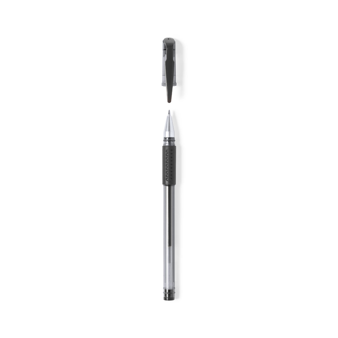 Bolígrafo en tinta gel de original diseño transparente, con empuñadura, capucha y detalles a juego. Disponible en varios colores de escritura, con tinta en el mismo color que los acabados del bolígrafo. Tinta Gel