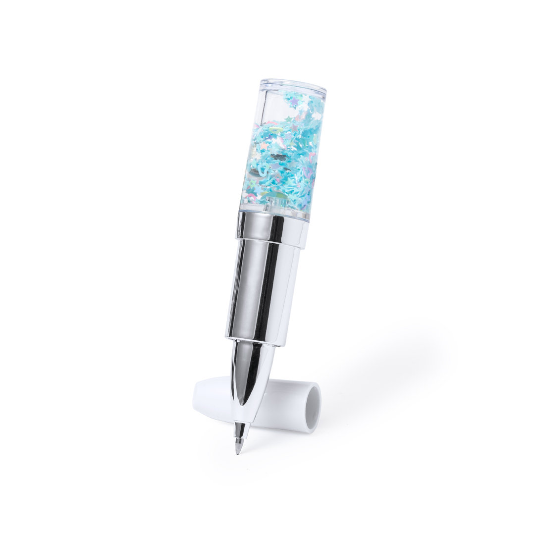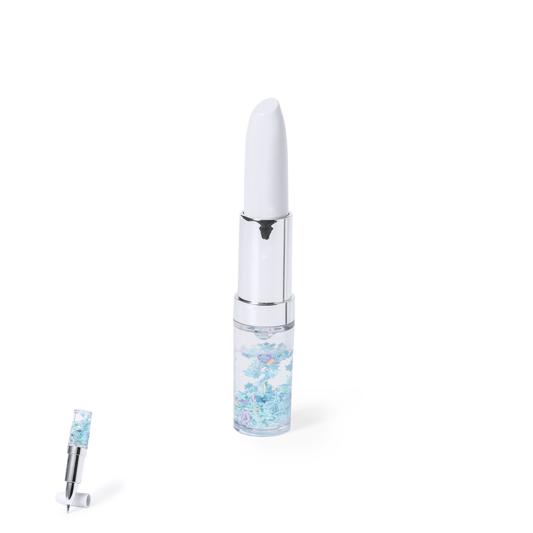 Original bolígrafo en forma de pintalabios, con líquido interior en colorido diseño. Con capucha y en tinta azul.