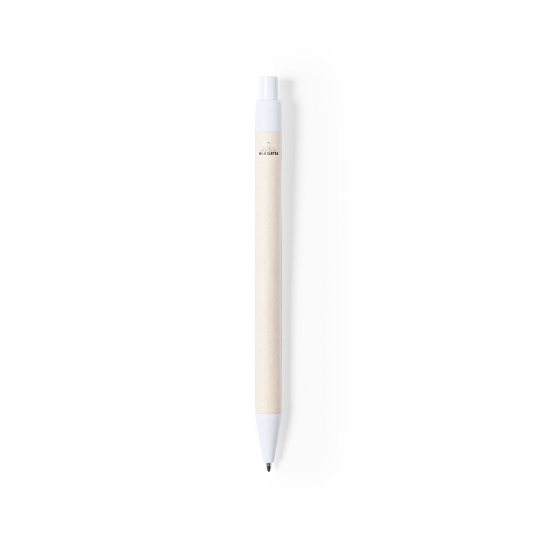Bolígrafo de línea nature, con cuerpo fabricado con cartones de leche reciclados y detalles en color blanco. De mecanismo pulsador y en tinta azul, con distintivo cartón de leche reciclado en el cuerpo. Los cartones de leche se componen en su mayor parte de cartón y aluminio. Durante su proceso de reciclado, se separan los distintos materiales del envase para su reutilización y nuevo uso, contribuyendo así a recorrer el camino infinito de la economía circular. Este material se caracteriza por su alto grado de reciclabilidad, así como por su ligereza y resistencia. Cartones de Leche Reciclados