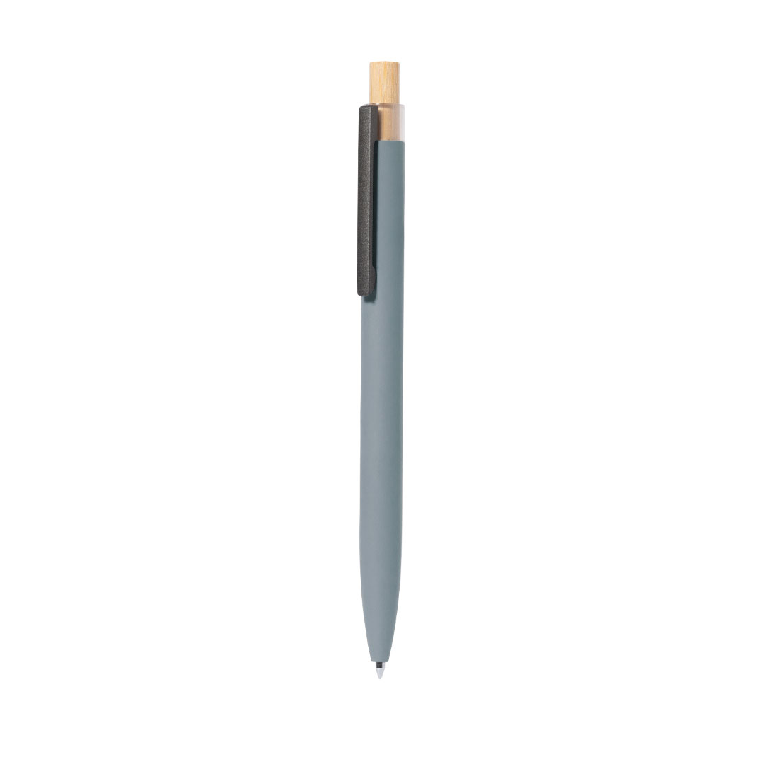 Bolígrafo de mecanismo pulsador fabricado en aluminio reciclado. Pulsador en bambú y cuerpo acabado goma, disponible en variada gama de elegantes colores. Clip metálico y distintivo aluminio reciclado en la parte superior del bolígrafo. De cartucho jumbo y en tinta azul. Presentado en bolsa individual reciclada.El aluminio reciclado es un material con posibilidades de reciclaje casi infinitas, sin perder sus propiedades originales y consumiendo menos energía en este proceso.Certificación GRS (Global Recycled Standard / Estándar de Reciclaje Global), que garantiza el origen reciclado del material usado para fabricar el producto. Carga Jumbo Aluminio Reciclado/ Bambú