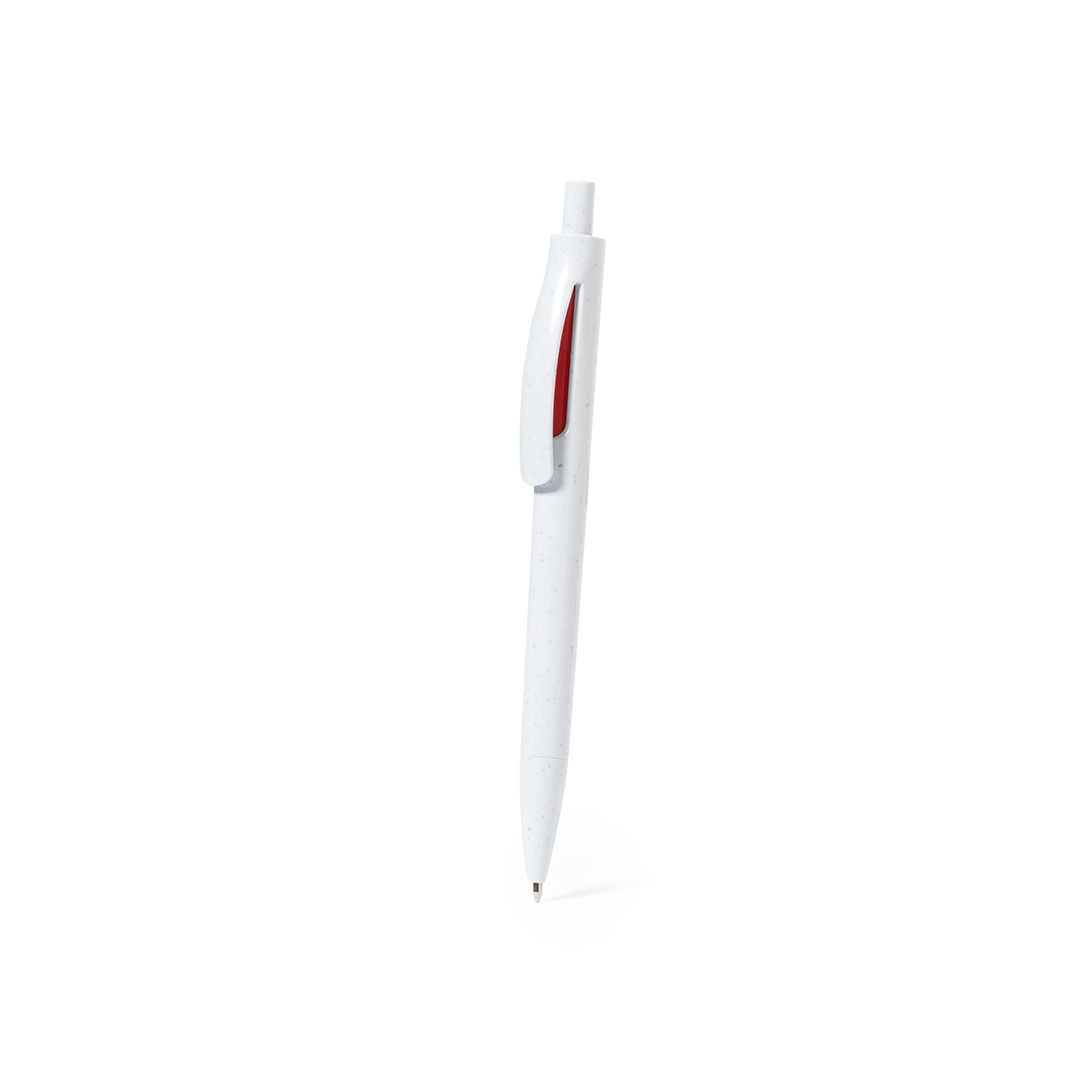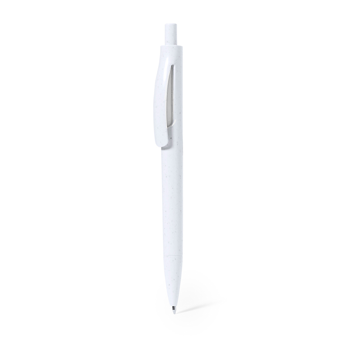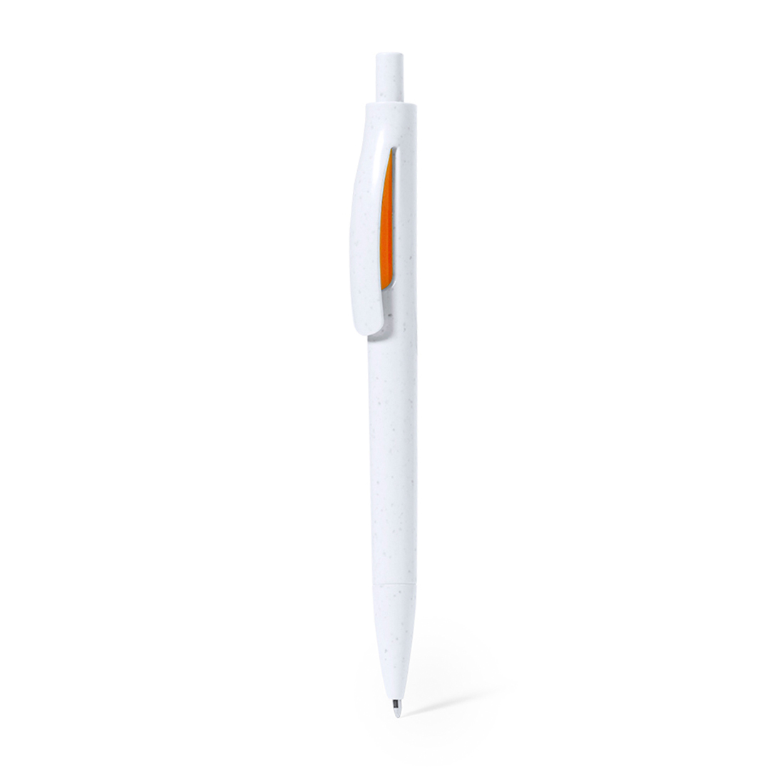 Bolígrafo de mecanismo pulsador fabricado en ABS reciclado. Con accesorios en vivos colores y cuerpo de suave acabado en color blanco sólido. Distintivo ABS reciclado en la parte superior del bolígrafo. En tinta azul. ABS Reciclado