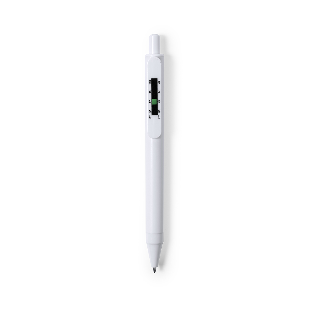 Bolígrafo antibacteriano de mecanismo pulsador con termómetro integrado en clip. Diseño monocromático, especialmente diseñado para marcaje en tampografía. En tinta azul y presentado en bolsa individual de diseño.Los productos con tratamientos antibacterianos son capaces de reducir drásticamente las cargas bacterianas presentes en las superficies de los materiales, gracias a la incorporación de agentes microbianos permanentes estáticos, con alta efectividad para inhibir y prevenir la contaminación bacteriana.Artículo de acuerdo al estándar ISO 22196, que determina la actividad antibacteriana en materiales plásticos y superficies no porosas, lo que permite conocer la efectividad de inhibición microbiana que tienen los aditivos sobre los objetos tratados mediante una evaluación cuantitativa.   Función Termómetro