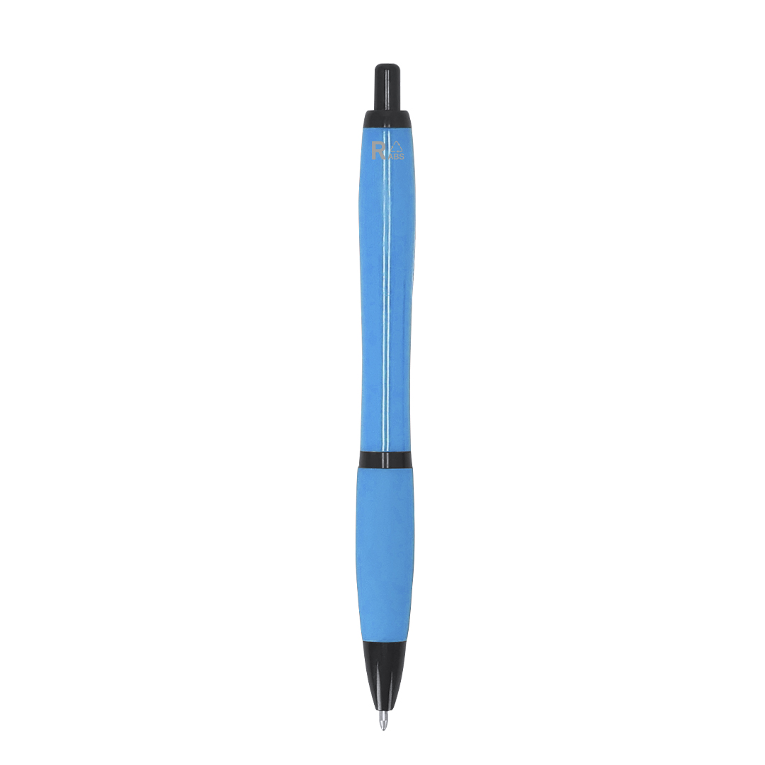 Bolígrafo de mecanismo pulsador en resistente RABS. Clip, pulsador y punta en negro. En tinta azul. Incluye distintivo RABS. ABS Reciclado
