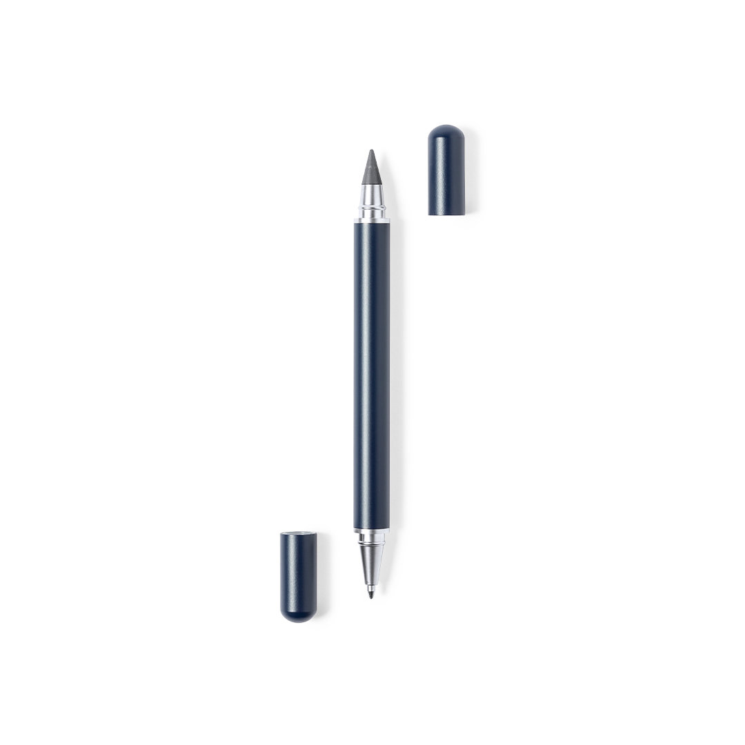 Bolígrafo lápiz eterno 2 en 1, fabricado en resistente metal de acabado brillo. Con cierre de capucha, incluye bolígrafo en un extremo (carga jumbo y tinta azul), y lápiz eterno en el otro extremo, para así usar siempre el mismo lápiz y no generar residuos. Presentado en estuche individual negro.   Carga Jumbo   Metal