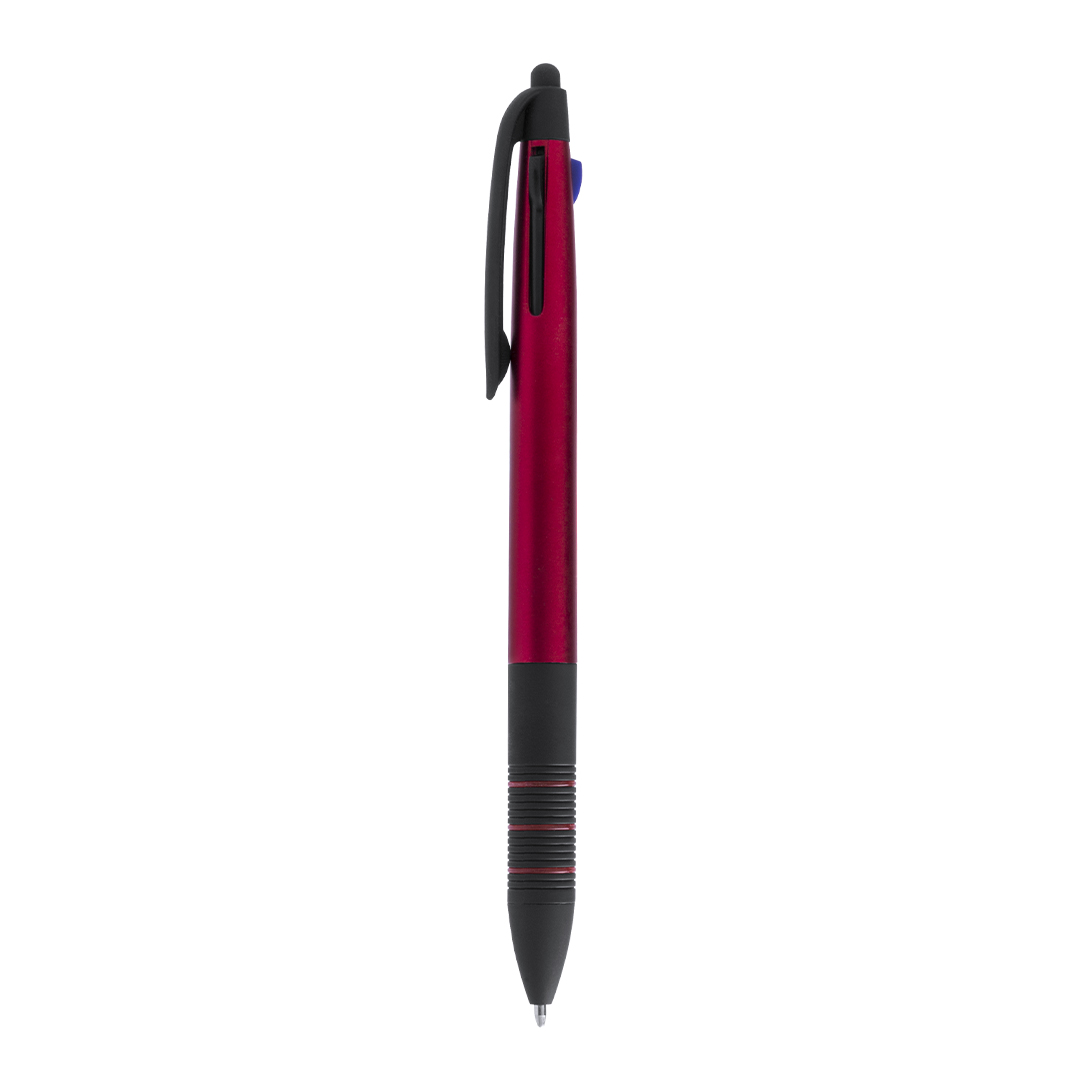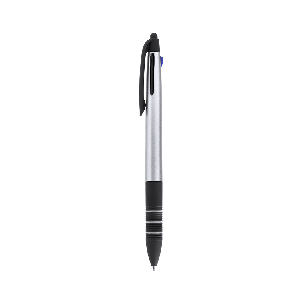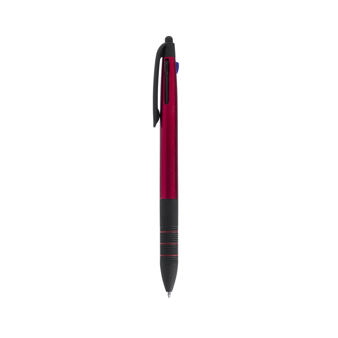 Bolígrafo puntero 3 en 1 de mecanismo pulsador retráctil, de actual diseño y cuerpo de suave acabado metalizado en vivos colores. Con accesorios en negro y suave empuñadura ergonómica en color negro con anillas a juego. De 3 cartuchos en tintas azul, roja y negra. Escritura 3 Colores