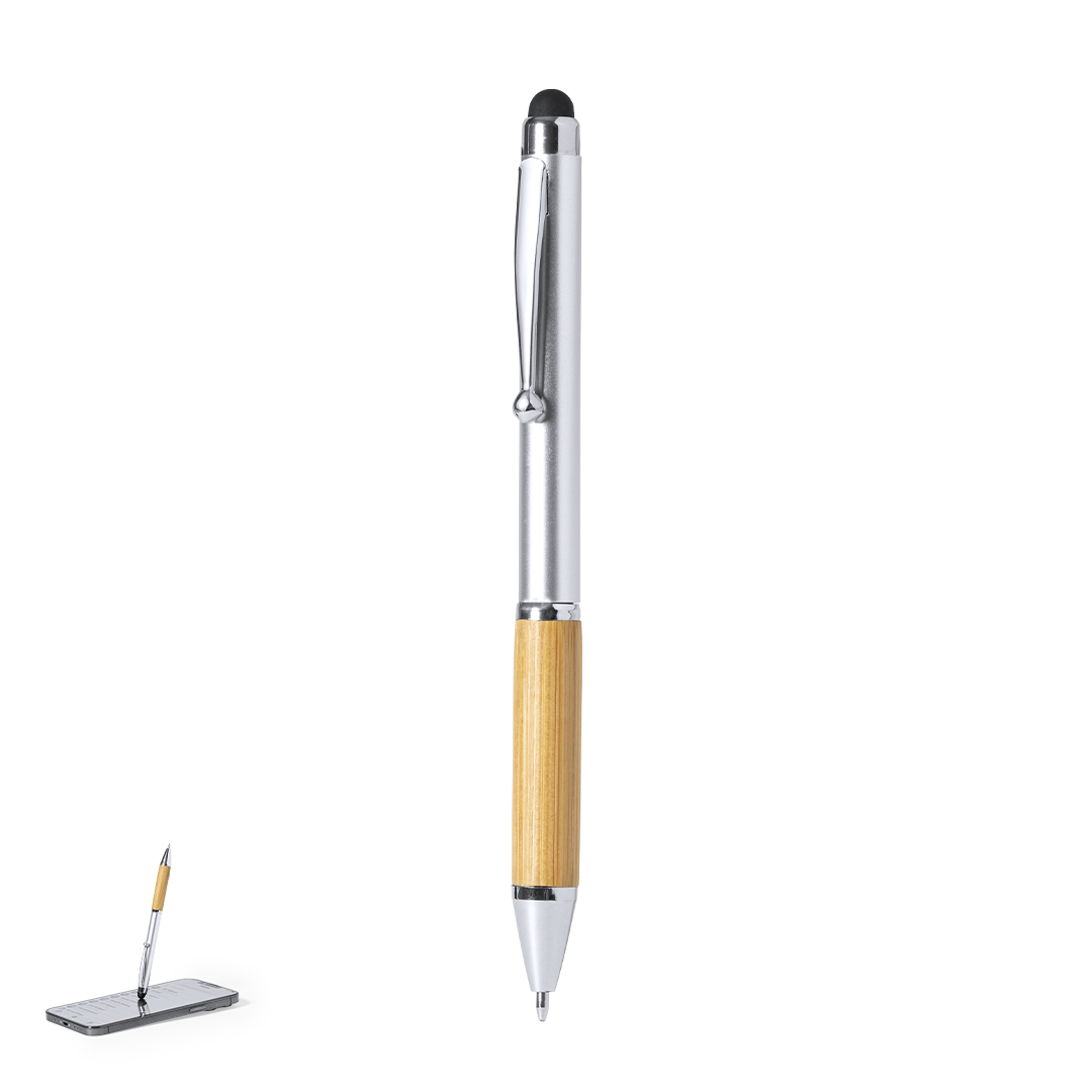 Elegante bolígrafo puntero de línea nature y mecanismo giratorio. Cuerpo en resistente ABS de acabado brillo y empuñadura en bambú, con accesorios a juego. Clip metálico y en tinta azul. ABS/ Bambú