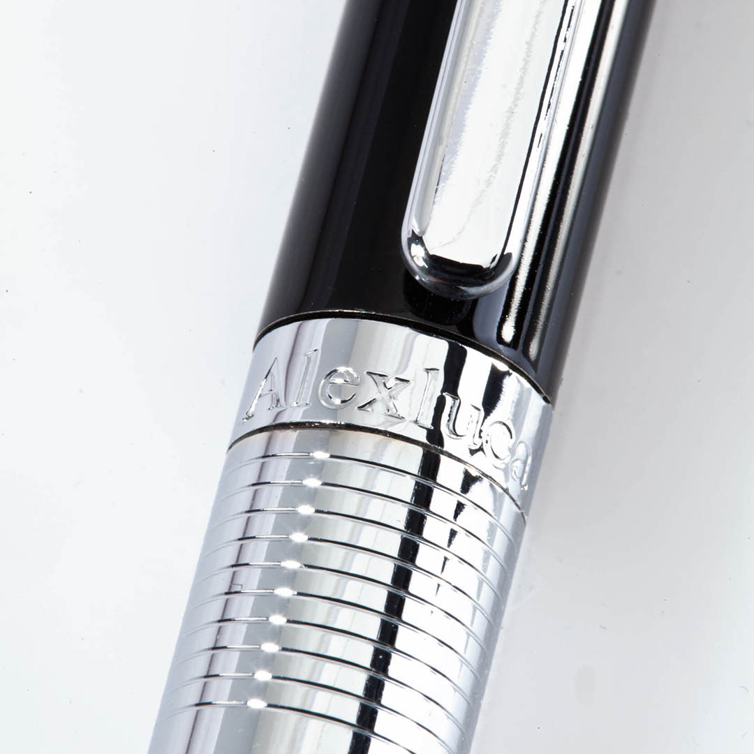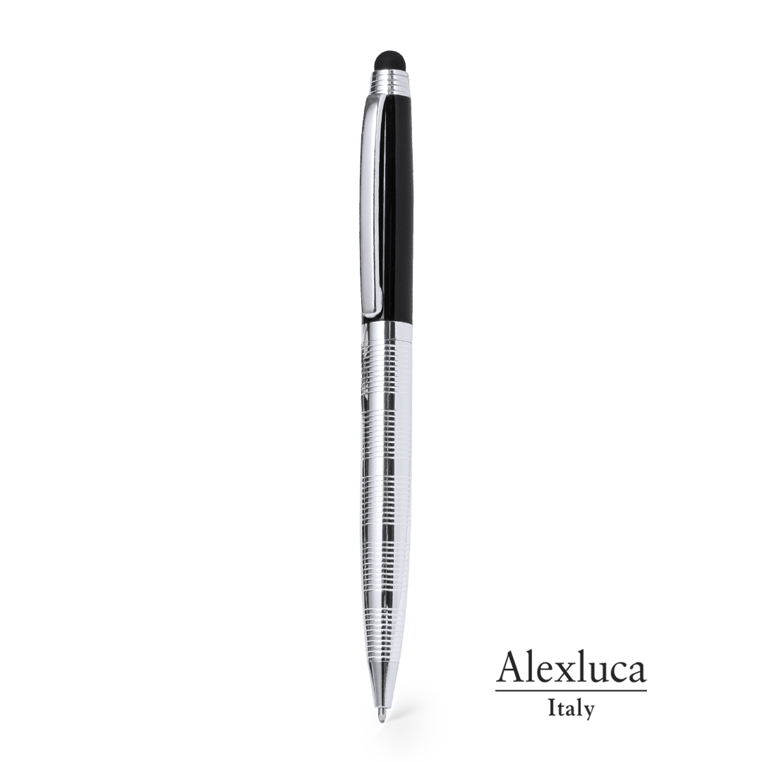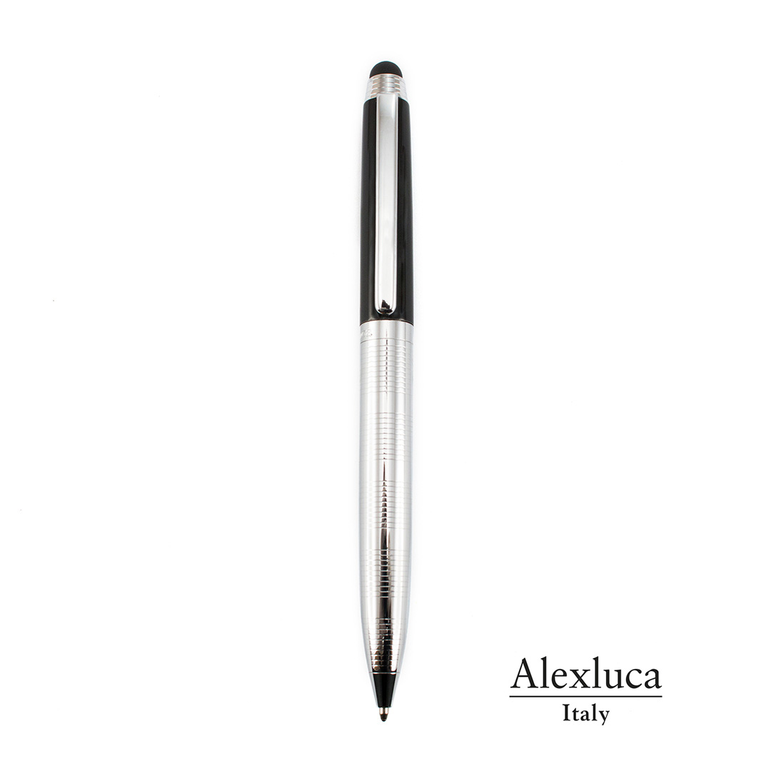 Bolígrafo puntero de Alexluca de mecanismo giratorio con suave cuerpo metálico, de elegante combinación de colores en plateado y negro. Clip y empuñadura de diseño a juego. Presentado en estuche individual negro con logotipo de la marca. Tinta azul. Metal