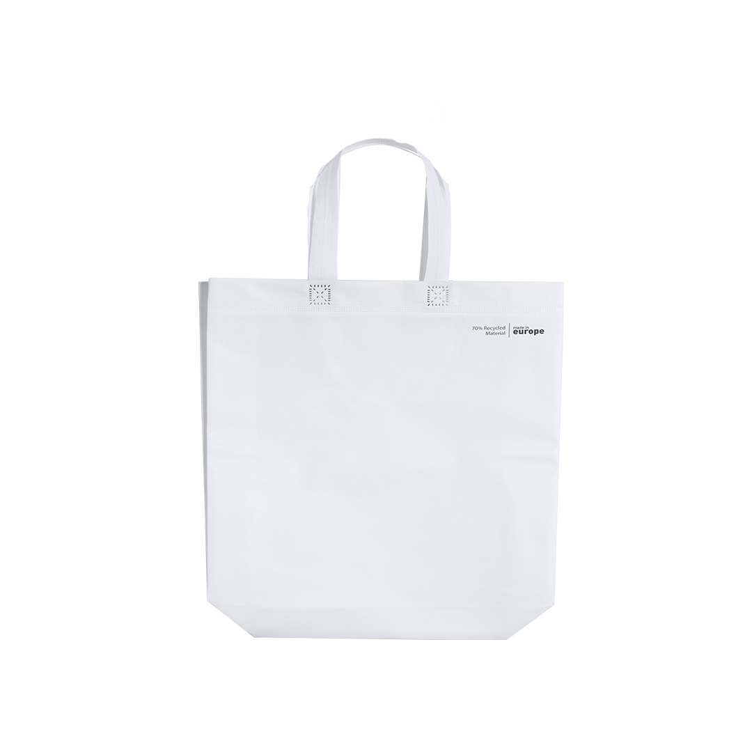 Bolsa de línea nature, fabricada en non-woven laminado reciclado de 120g/m2. De fabricación europea, con acabado termosellado, con fuelle, asas largas y distintivo eco/made in sobre la bolsa. Non-Woven Reciclado Laminado