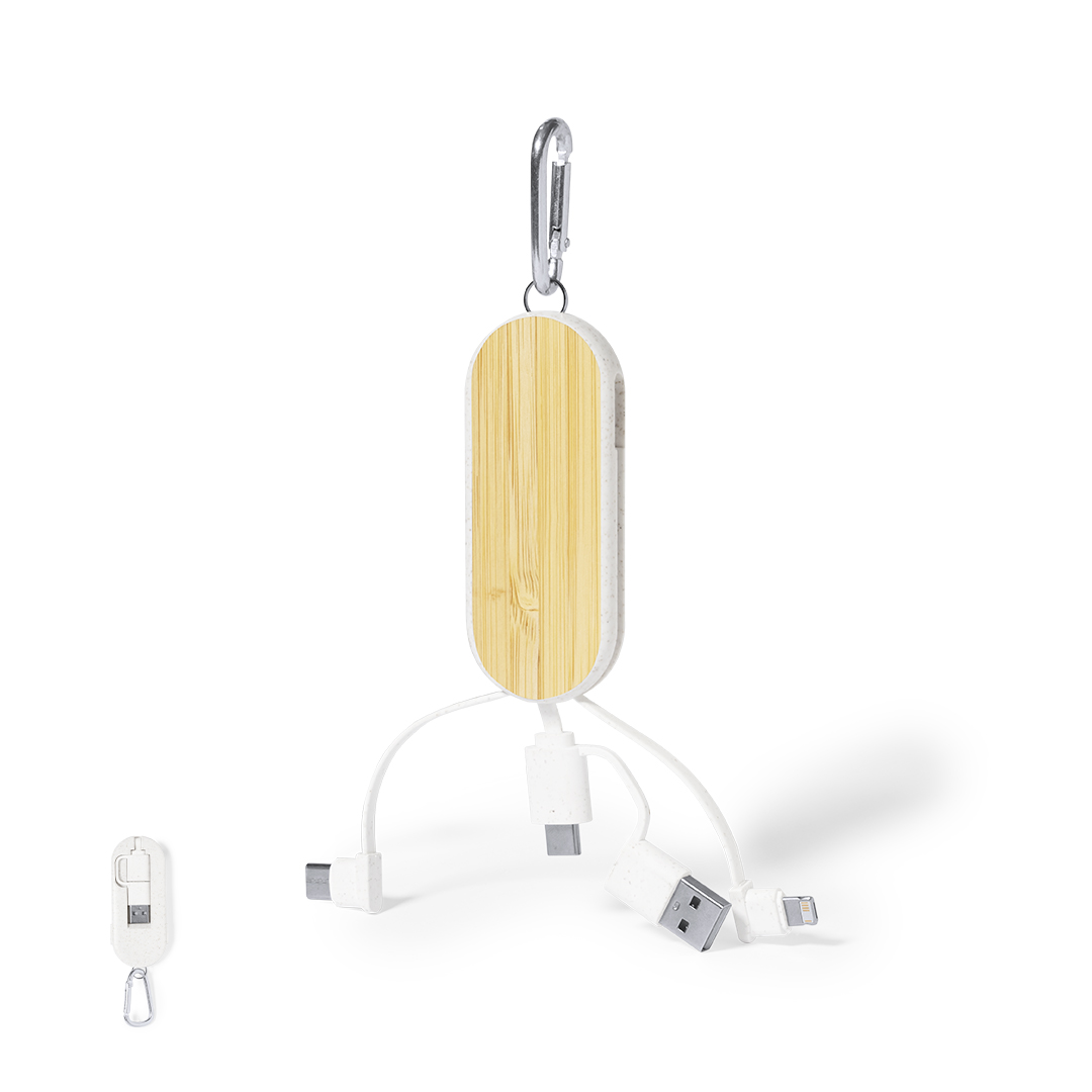 Cable cargador con mosquetón fabricado en fibra de trigo y bambú. Con conexiones de entrada Tipo C y USB y salidas Tipo C, lightning y Micro USB. 5V DC 2A. Presentado en bolsa individual de diseño kraft.Elaborado con elementos vegetales para así fomentar la utilización de materias primas naturales y reducir las emisiones contaminantes. Conexión Micro USB, Tipo C y Lightning 5V DC 2A Caña de Trigo/ ABS/ Bambú