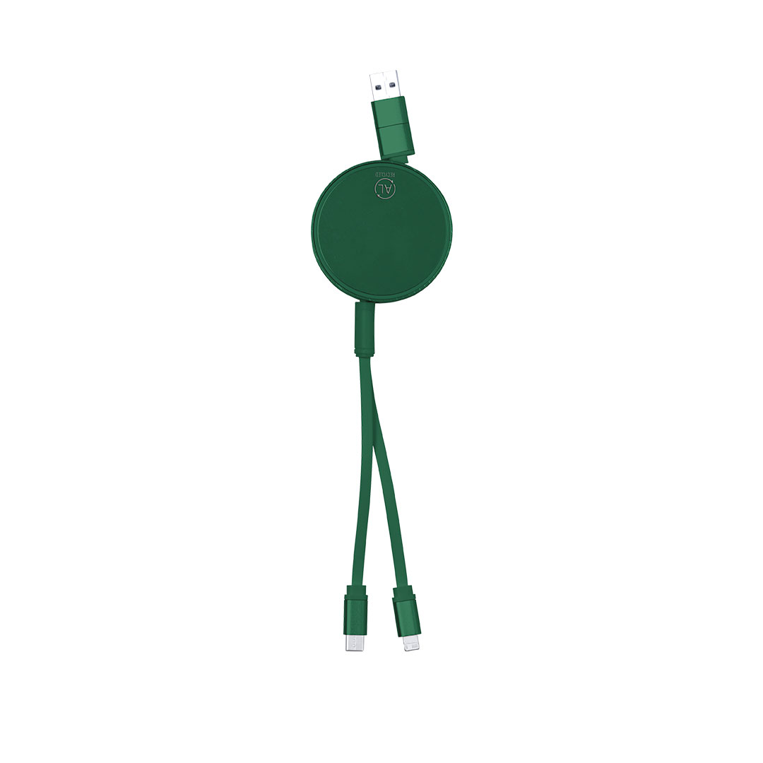 Cable cargador y sincronizador extensible, apto para transferencia de datos y fabricado en Aluminio Reciclado de acabado metalizado. Carcasa central con amplia superficie de marcaje, especialmente diseñada para grabado en láser. Disponible en variada gama de colores, con cables a juego. Conexiones de entrada Tipo C y USB, con salidas Lightning, Micro USB y Tipo C. 5V DC 2.4A. Presentado en bolsa individual de diseño kraft.El Aluminio Reciclado es un material con posibilidades de reciclaje casi infinitas, sin perder sus propiedades originales y consumiendo menos energía en este proceso.Certificación GRS (Global Recycled Standard / Estándar de Reciclaje Global), que garantiza el origen reciclado del material usado para fabricar el producto. Cable Extensible. Conexión Micro USB, Tipo C y Lightning 5V DC 2.4A Aluminio Reciclado