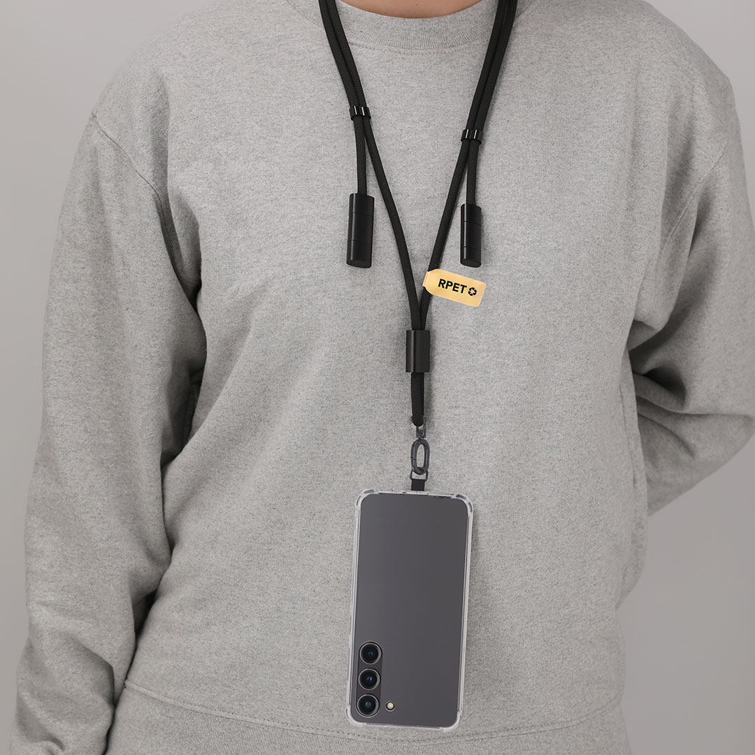 Innovador lanyard con función de soporte y cable cargador, fabricado en una combinación de poliéster RPET y aluminio reciclado. Diseñado para colocarse fácilmente entre la funda y el smartphone gracias a su accesorio de transporte. Incluye cinta a juego, mosquetón metálico giratorio en color negro y accesorio de seguridad para el cuello. Ofrece funcionalidad de carga y traspaso de datos, con entrada USB y Tipo C, y salidas Micro USB, Lightning y Tipo C. Presenta un distintivo de RPET en etiqueta kraft, destacando su compromiso sostenible.El material RPET se elabora a partir de plástico reciclado, para así fomentar la reutilización de residuos plásticos y ayudar a la sostenibilidad del planeta.El Aluminio Reciclado es un material con posibilidades de reciclaje casi infinitas, sin perder sus propiedades originales y consumiendo menos energía en este proceso.Certificación GRS (Global Recycled Standard / Estándar de Reciclaje Global), que garantiza el origen reciclado del material usado para fabricar el producto. Conexión Micro USB, Tipo C y Lightning 5V DC 2.4A Aluminio Reciclado/ Poliéster RPET