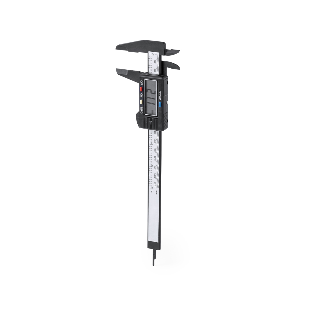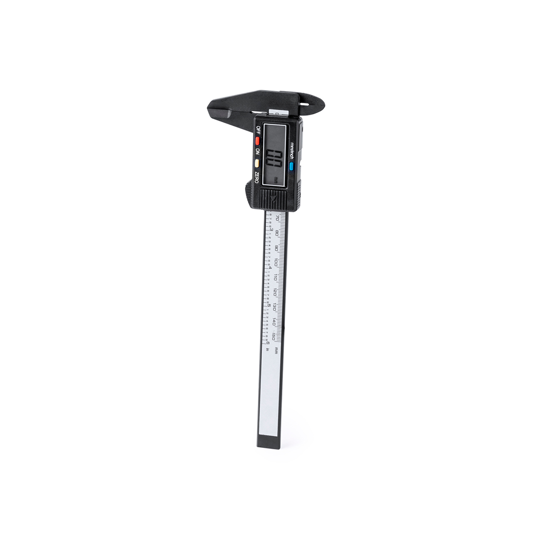 Calibre pie de rey con modo de medición digital y analógico. Con pantalla LCD y botones ON/OFF, ZERO para ajuste y otro para seleccionar la medida en mm o en pulgadas. Incluye sonda para medir la profundidad y pinzas para el medir el interior de los objetos. Rango de medición hasta 150 mm, con instrucciones en español e inglés y presentado en caja individual de diseño kraft. Pila Botón Incluida