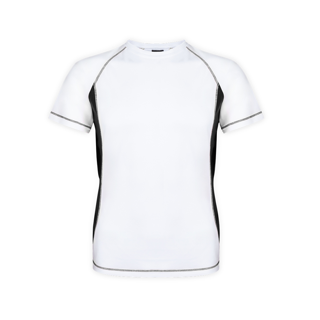 Camiseta técnica para adulto en material 100% poliéster transpirable de 135g/m2. Diseño en color blanco con costuras de refuerzo y laterales en vivos colores. Disponible en tallas S, M, L, XL, XXL. Transpirable 100% Poliéster 135 g/ m2