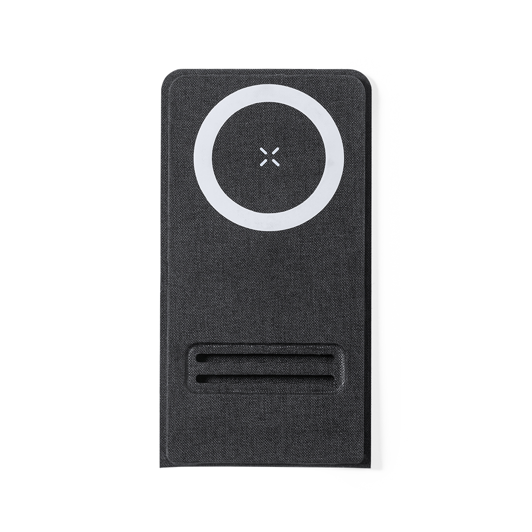 Cargador inalámbrico 15W. Fabricado en resistente poliéster 300D y con fijación magnética para poder usar el dispositivo mientras se produce la carga del mismo e incluyendo anillo adhesivo. Válido para todos los dispositivos con tecnología Magsafe y Qi. Plegado de pequeño tamaño para fácil transporte y presentado en atractiva caja individual de diseño. Inalámbrico 15W. Magnético. Plegable Poliéster 300D