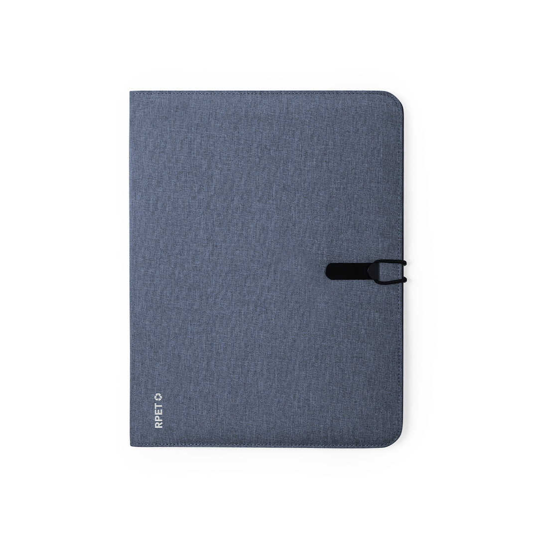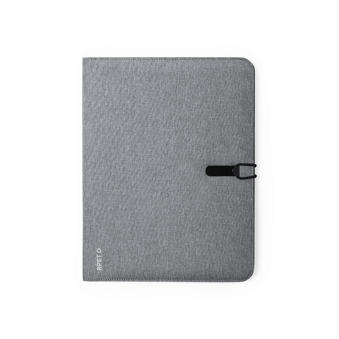 Elegante carpeta de línea nature tamaño A4. Fabricada en resistente 600D RPET efecto melange, elaborado a partir de plástico reciclado para así fomentar la reutilización de residuos plásticos y contribuir a la sostenibilidad del planeta. Detalles en negro y cierre metálico con cinta elástica especialmente diseñado para marcaje en láser. Interior con bloc extraíble de 20 hojas con disposición a una raya, 3 bolsillos de solapa, tarjeteros y soporte para bolígrafo. Distintivo RPET en esquina. Bloc 20 Hojas Poliéster 600D RPET