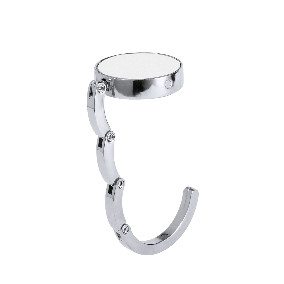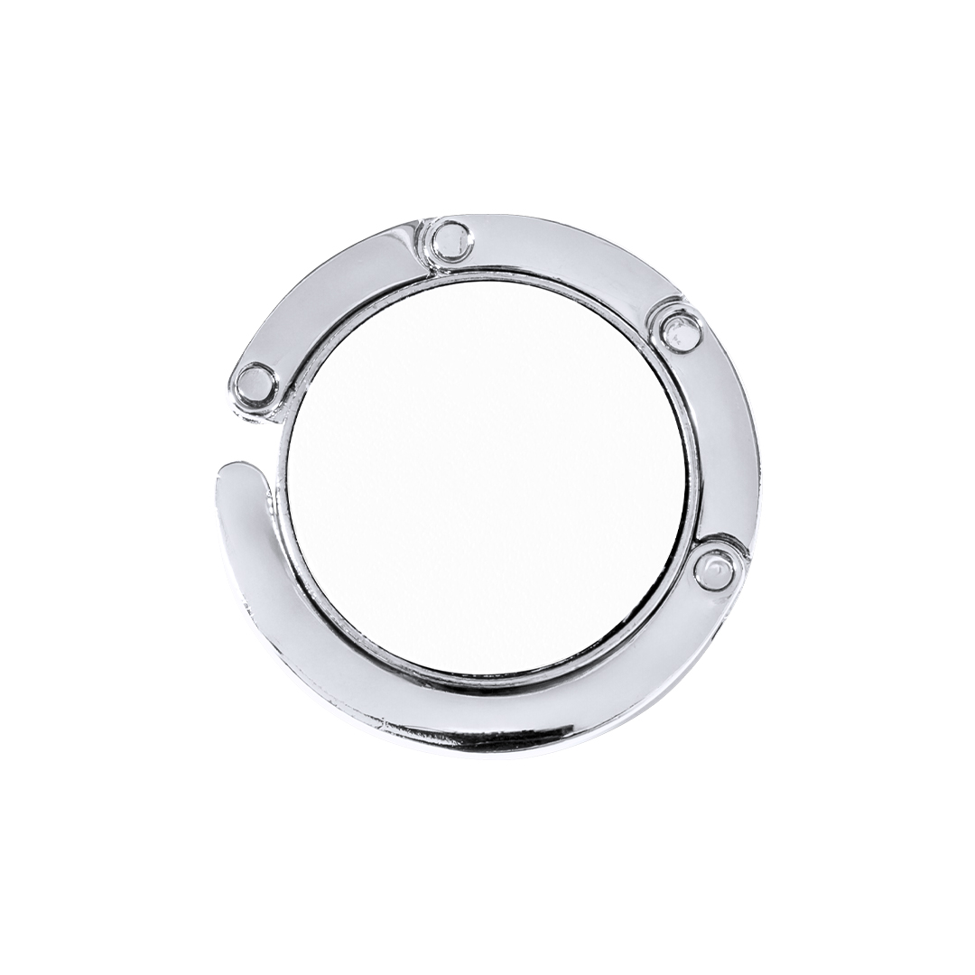 Cuelgabolsos metálico plegable con corona en polipiel de vivos colores. Presentado en estuche individual con interior troquelado. Metal/ Polipiel