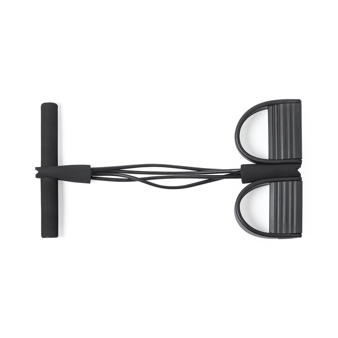 Cuerda de tensión para mantenerse en forma al aire libre o desde casa, diseñada para realizar una gran variedad de ejercicios. Fabricada en resistente combinación de ABS y EVA con asas ergonómicas acolchadas en espuma y soportes para pies recubiertos en EVA, con calapiés de seguridad. De resistencia media y con folleto de ejercicios. Presentada en funda a juego de poliéster RPET, elaborada a partir de plástico reciclado para así fomentar la reutilización de residuos plásticos y contribuir a la sostenibilidad del planeta. Etiqueta RPET distintiva en funda. Resistencia Media. Funda Poliéster RPET TPE/ EVA