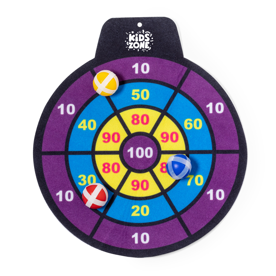 Divertida diana de tela con pelotas de velcro. Perfecta para todas las edades ofreciendo un objetivo desafiante y seguro. El juego consiste en lanzar a la diana con puntuaciónes las pelotas de distintos colores, que se quedarán fijas gracias a su envoltura de velcro. Fácil de colgar en cualquier sitio y a cualquier altura mediante agujero. Incluye diana de tela flexible y 3 pelotas con velcro. Presentado en bolsa reciclada.   3 Bolas Incluidas   Poliéster