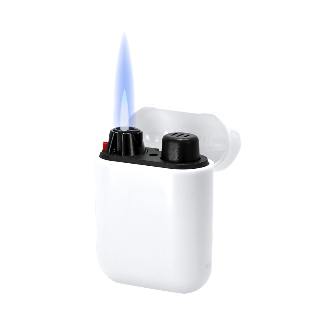 Encendedor a gas recargable. Con diseño original y compacto en blanco con regulador de llama y tapa con cierre. Recargable