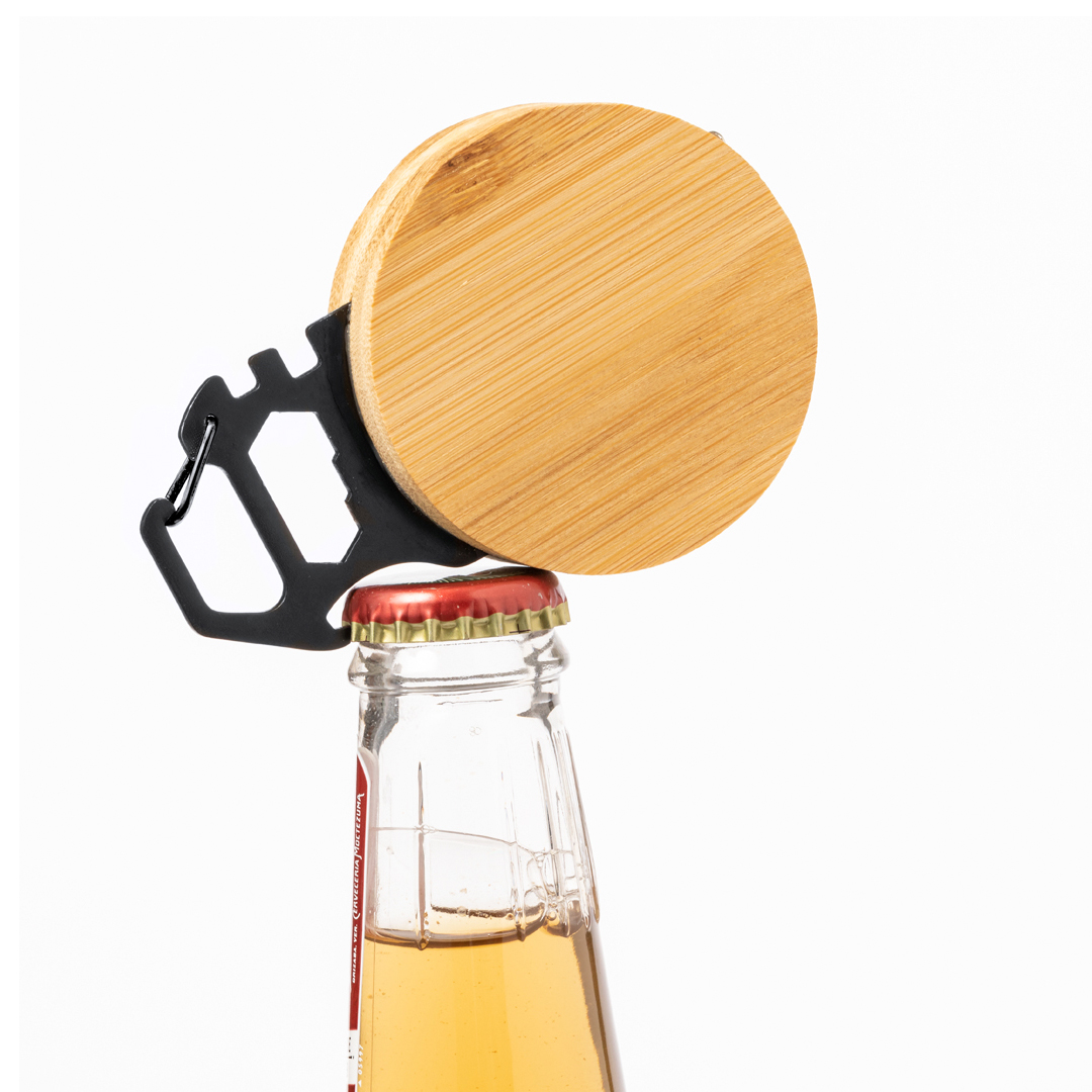 Multiherramienta con 7 funciones, fabricada en acero inox y bambú. Incluye un metro con medidas en centí metros y pulgadas (longitud de 1 metro), una llave para tuercas hexagonales en varios tamaños y un abridor. Además, cuenta con un mosquetón para facilitar el transporte. Presentada en caja de diseño kraft.Materiales como el bambú fomentan la utilización de materias primas naturales, reduciendo las emisiones contaminantes. Proviene de una planta de gran resistencia y versatilidad, con crecimiento y regeneración rápidos, siendo una excelente alternativa al uso de madera tradicional. 7 Funciones Bambú/ Acero Inox