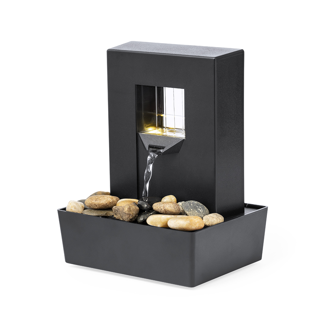 Fuente portátil de agua infinita con luces LED. Cascada de agua sobre piedras naturales, ideal para decoración o momentos de relajación. Incluye un depósito para el agua y una estructura iluminada por LEDs de tonos naturales, a través de la que fluye el agua. Alimentada por 3 pilas AA (no incluidas). Presentada en caja de diseño kraft. 1 Led. 20 Piedras Incluidas. 3 Pilas AA No Incluidas