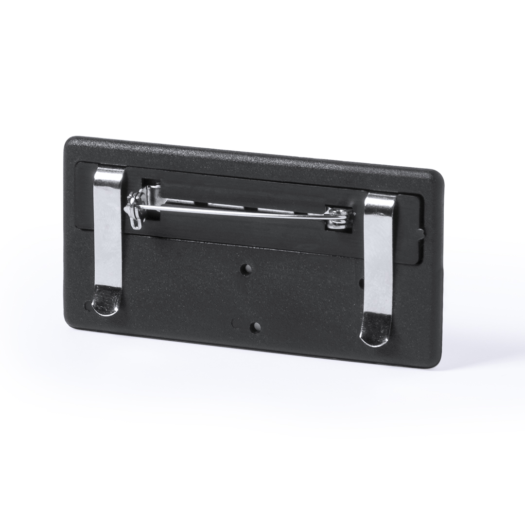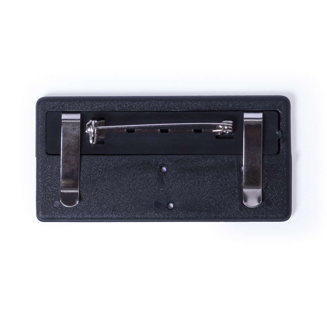 Identificador en acabado brillante. Parte trasera con doble sistema de fijación -pinzas de enganche metálicas e imperdible- para un ajuste seguro.