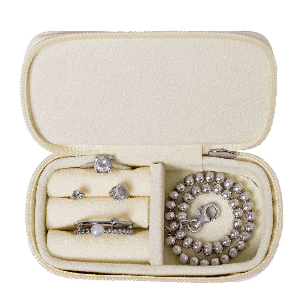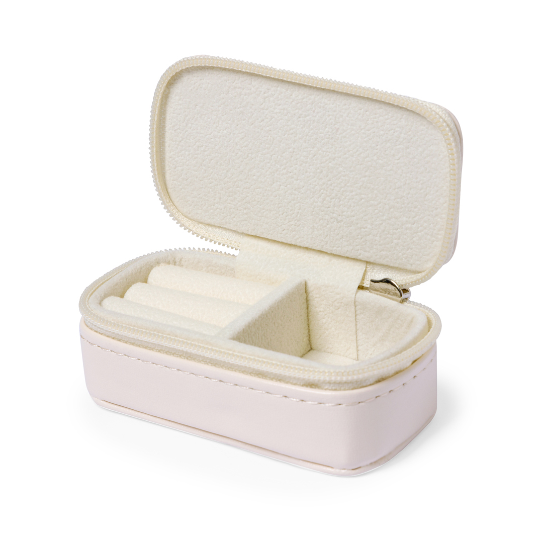 Estuche joyero fabricado en polipiel. Diseño de color natural con cierre de cremallera y dos compartimentos en su interior. Un compartimento en forma de cajita y otro compartimento con almohadillas para sujetar anillos y pendientes, forrado de suave tela. Presentado en una bolsa de papel individual. Polipiel