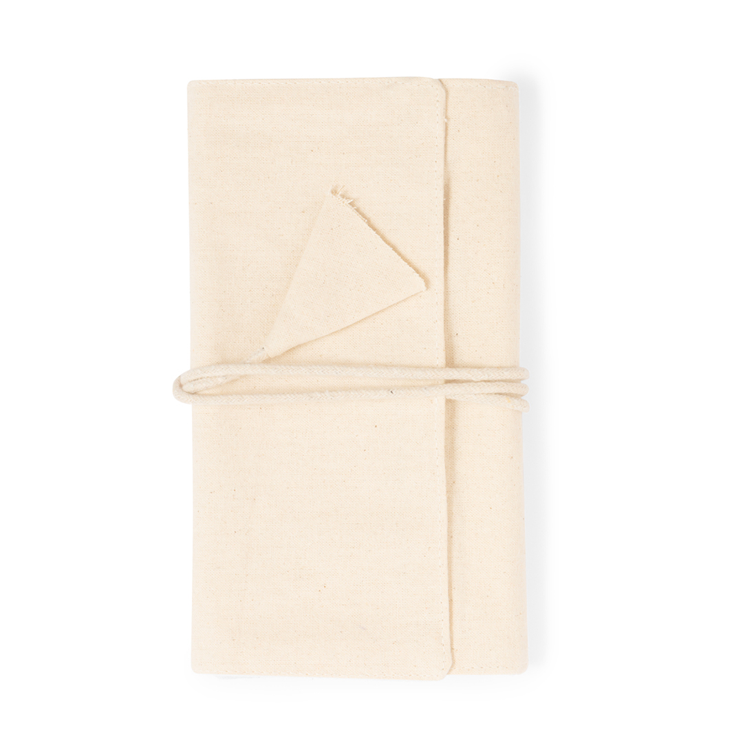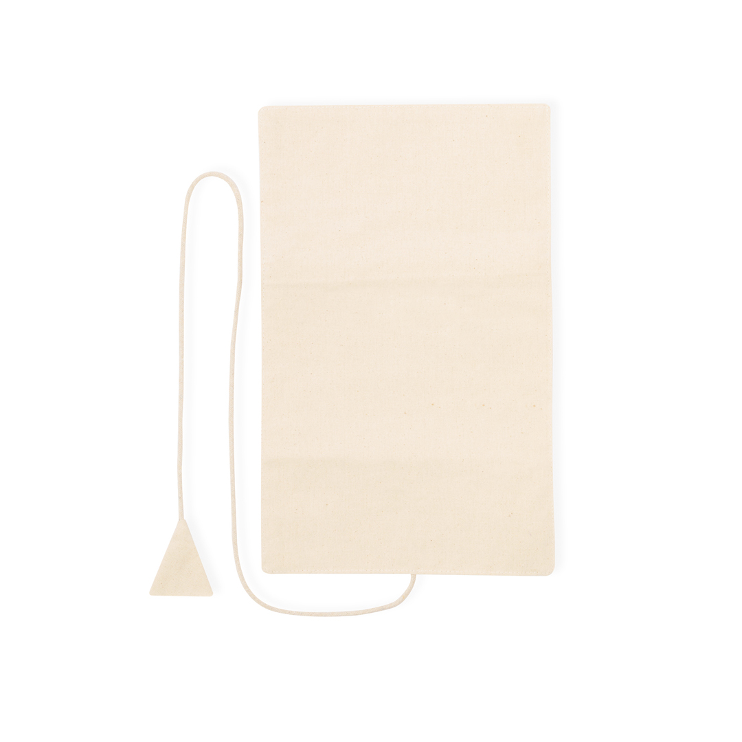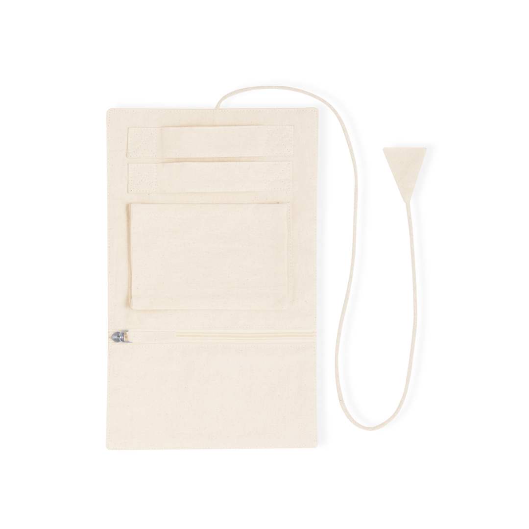 Joyero plegable fabricado en algodón, para guardar preciados artículos personales. Confeccionado en 3 partes de color natural: parte superior con cintas, parte central con bolsillo y parte inferior con bolsillo de cremallera, pudiendo plegarlo y sujetarlo firmemente con su cordón a juego. Algodón