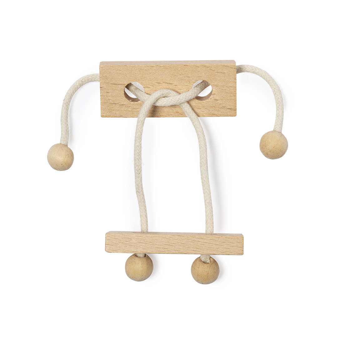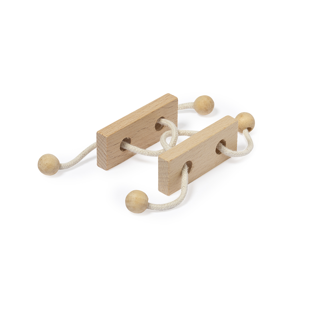 Juego de habilidad de 2 piezas fabricado en madera. Divertido rompecabezas de dos piezas unidas por un cordón de madera, cuyo objetivo es descubrir la forma de separar ambas piezas. Presentado individualmente en una caja de diseño kraft. Madera
